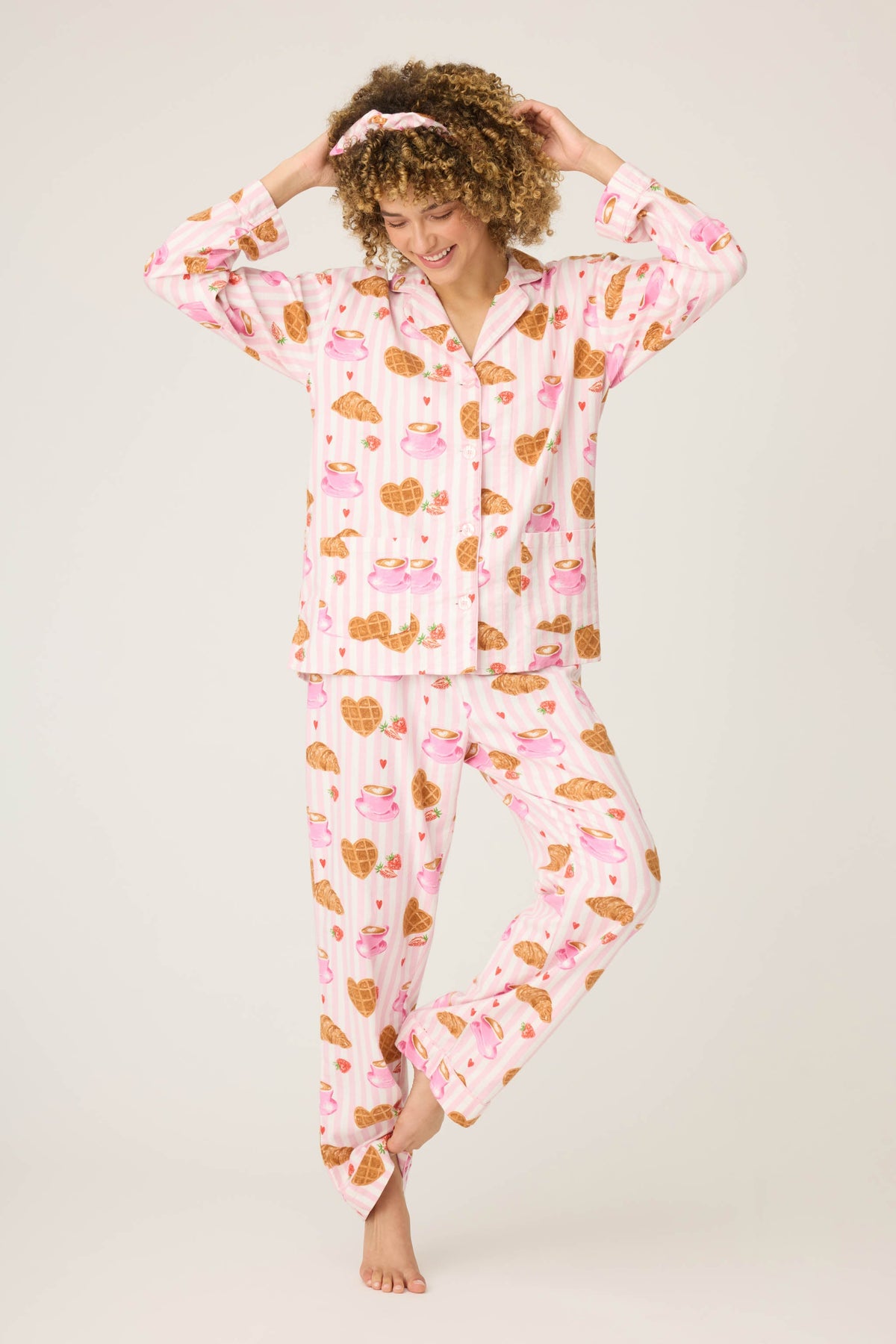 The Brunch Club Breakfast Print Flannel PJ Set is cozy, cheerful, and undeniably cute. With playful prints of heart-shaped waffles, croissants, strawberries, and latte cups against a pink-and-white stripe, this three-piece set brings Parisian café vibes to your loungewear. The set includes a button-down top with contrast piping, relaxed straight-leg pants with a drawstring waist, and a matching headband for the sweetest finishing touch.