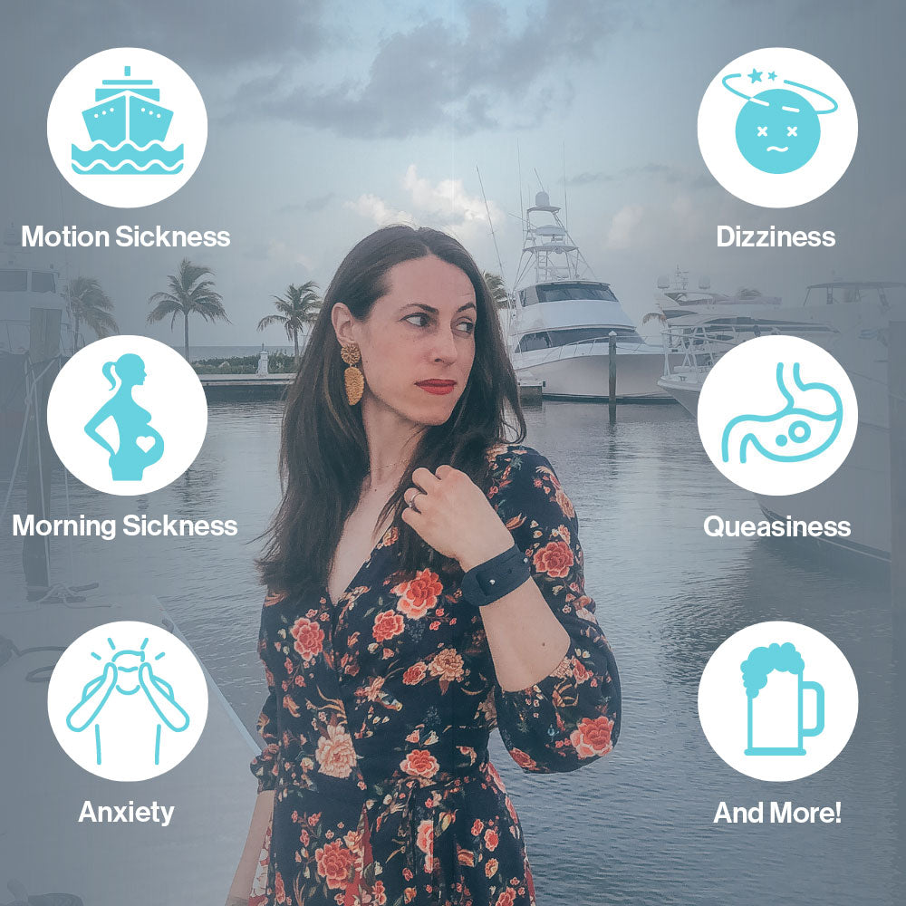 Chic bracelets that use acupressure to provide fast, natural relief from nausea and vomiting in as little as five minutes.