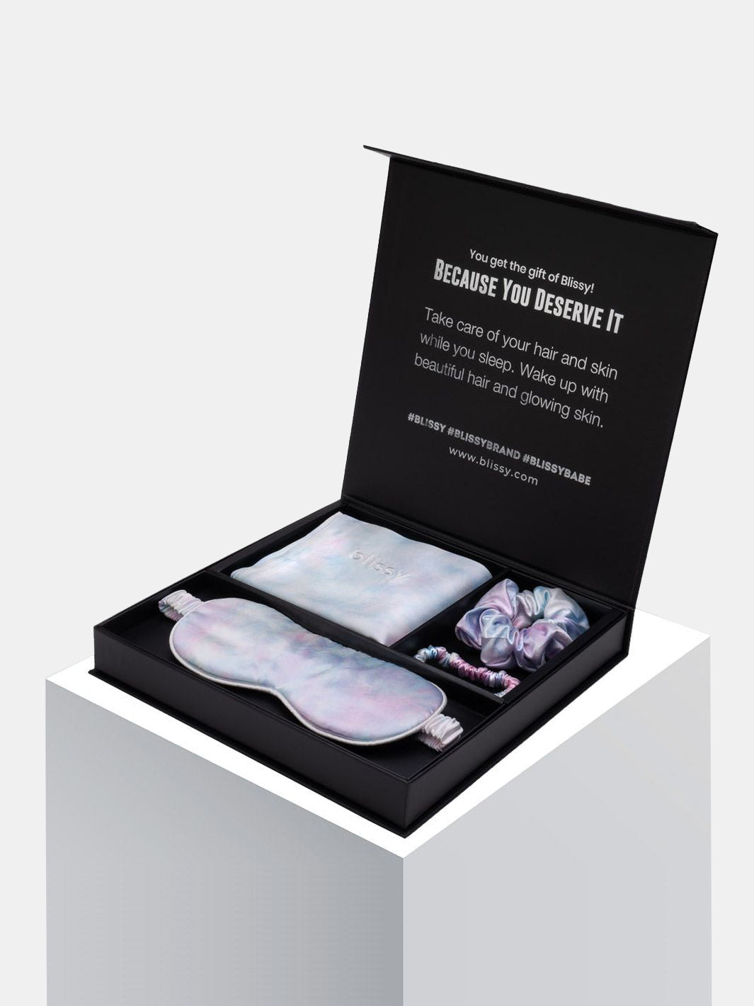 The Blissy Dream Set is the ultimate all-in-one beauty sleep collection, complete with a silk pillowcase, matching sleep mask, scrunchie, and skinny scrunchie. Each piece is beautifully crafted from pure silk to feel soft, smooth, and indulgent, turning your nightly routine into a moment of everyday luxury.