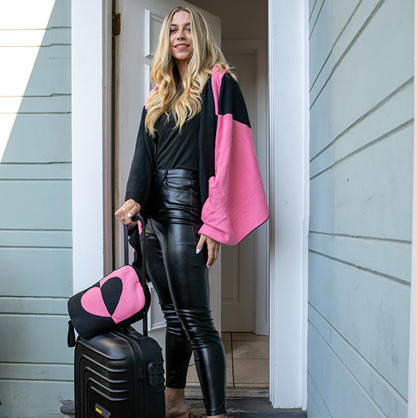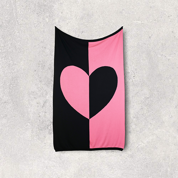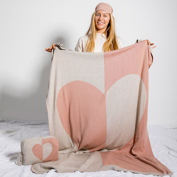 This oversize two-tone heart pattern is perfectly proportioned for maximum impact. Colorblock design makes a bold splash in any weekend bag. The set zips neatly inside a small carrying tote with a looped handle. The multi-purpose blanket can be used as a yoga mat, spa wrap, beach blanket or throw—and the eye mask can help take your sleep or meditation to the next level.