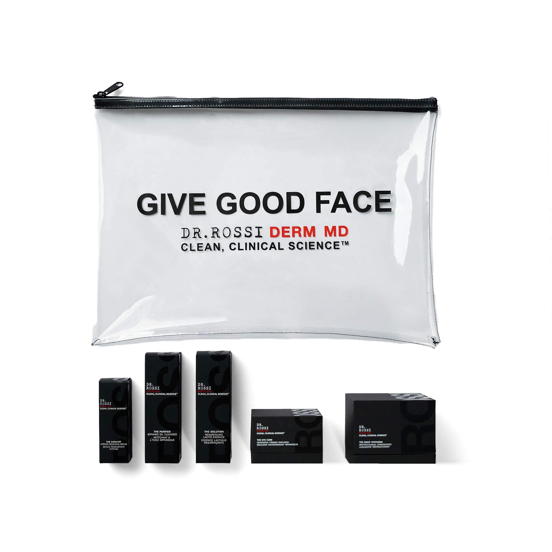 A limited-edition gift set featuring Dr. Rossi’s most-loved Bio-Theriac® formulas. This curated collection includes everything needed to cleanse, treat, brighten, and deeply nourish the skin, all tucked inside the GIVE GOOD FACE travel bag. With travel-friendly essentials and a full-size Night Synthesis, it creates a complete system for smoother, calmer, more radiant skin.