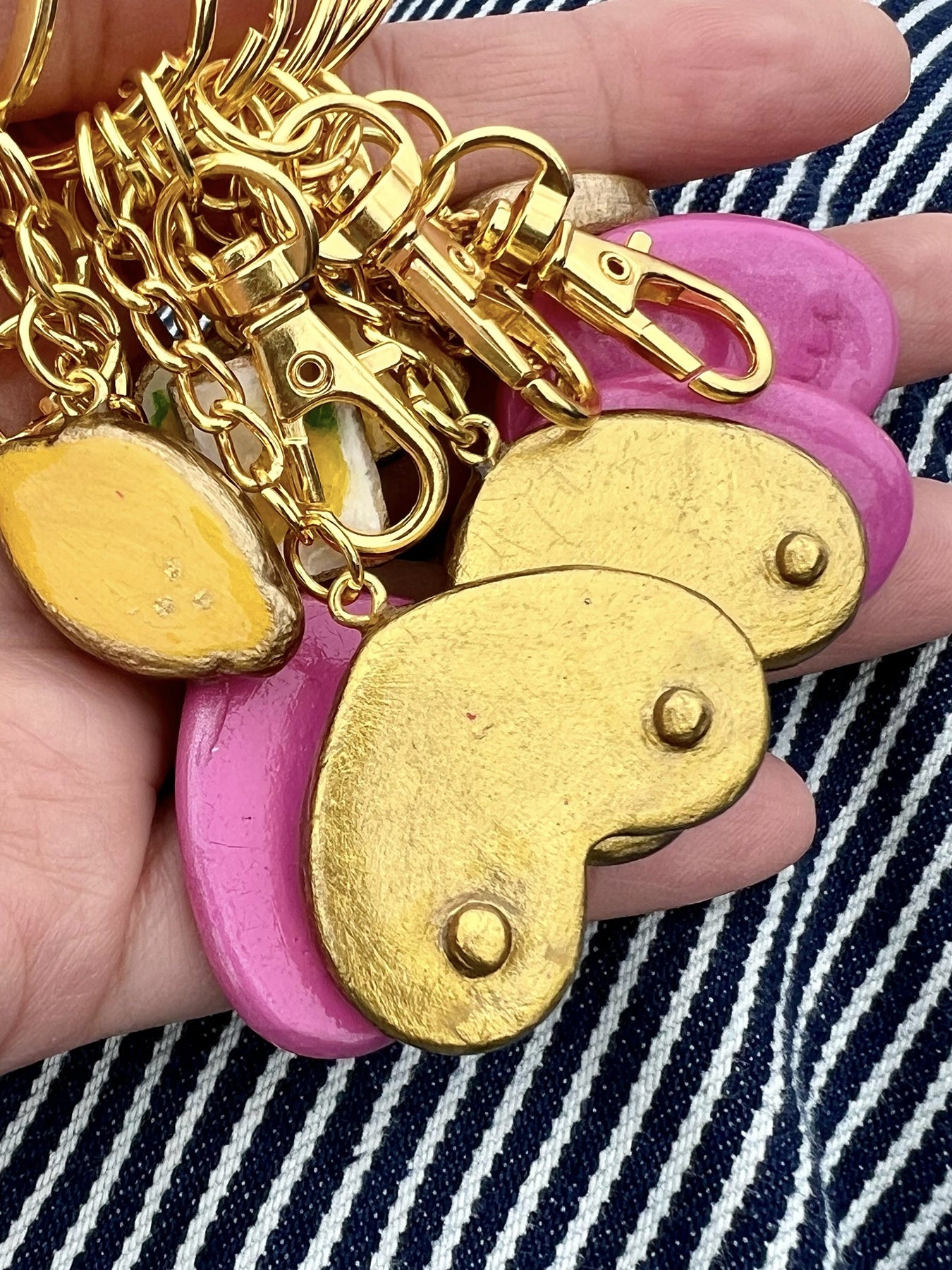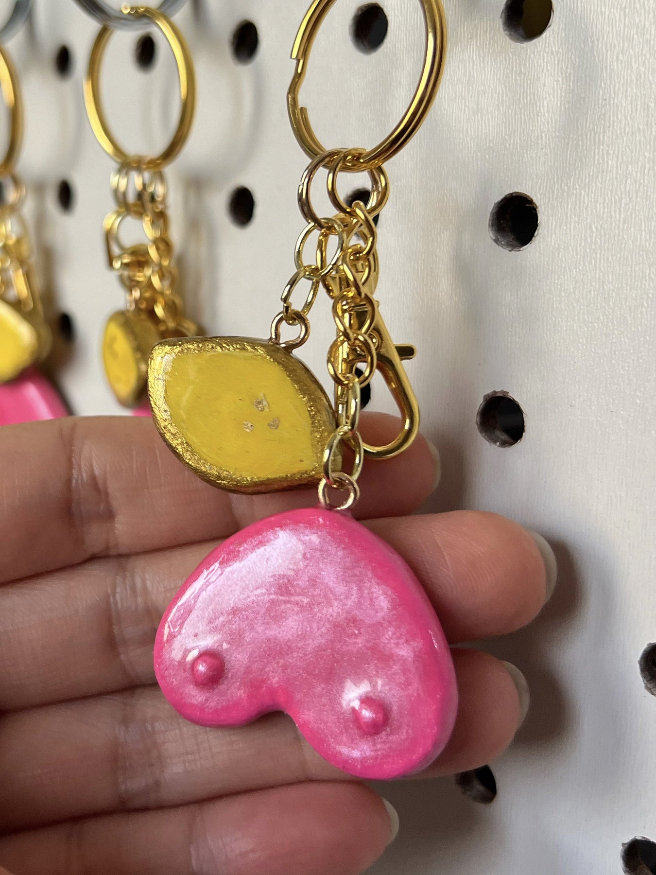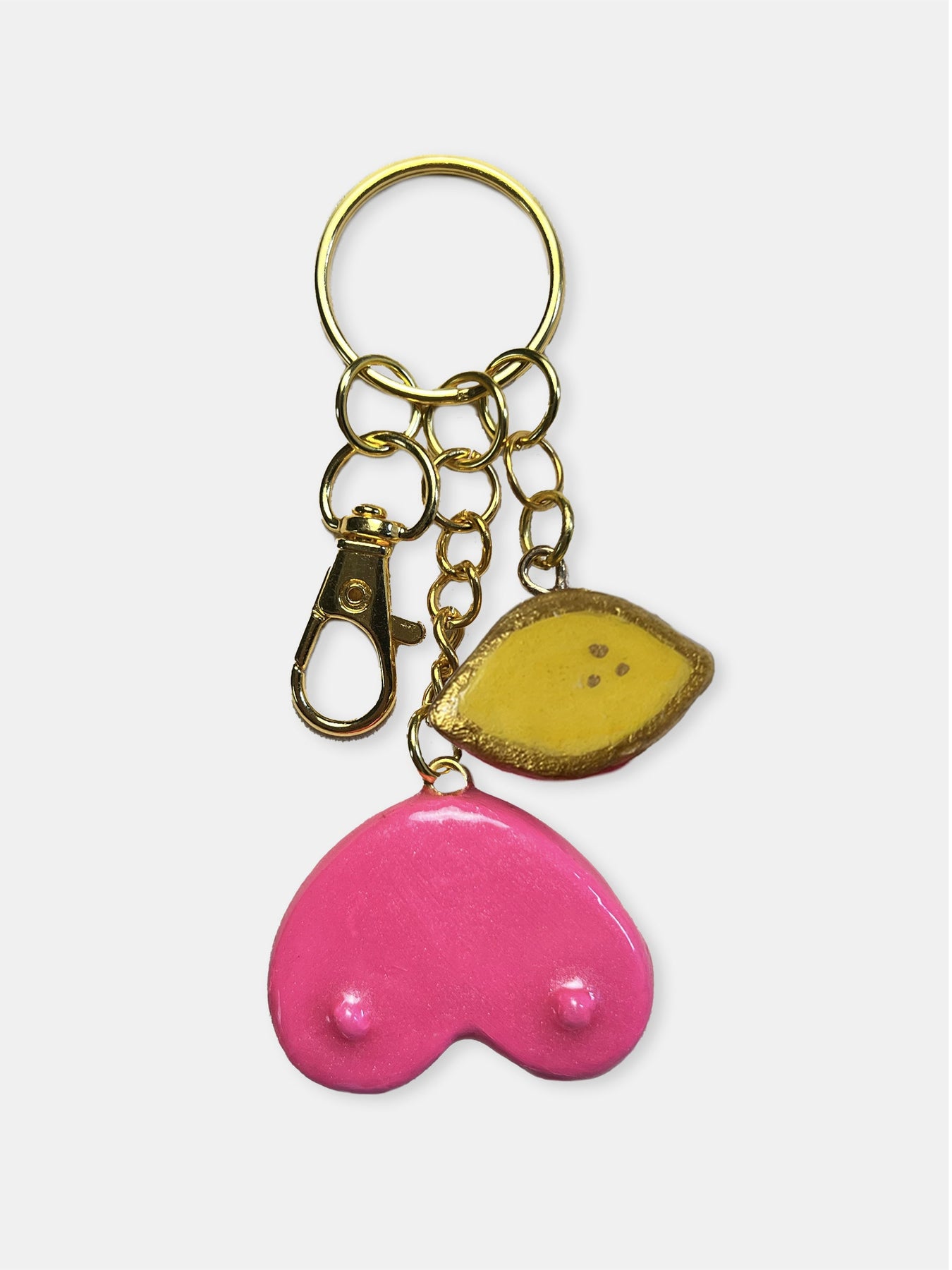 Each keychain includes a key ring and snap hook for versatile use. The Heart Boob and lemon charms are handmade and hand-painted, featuring a boob charm that symbolize resilience.