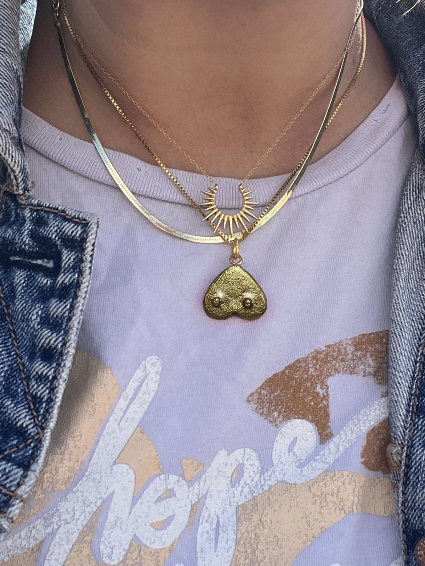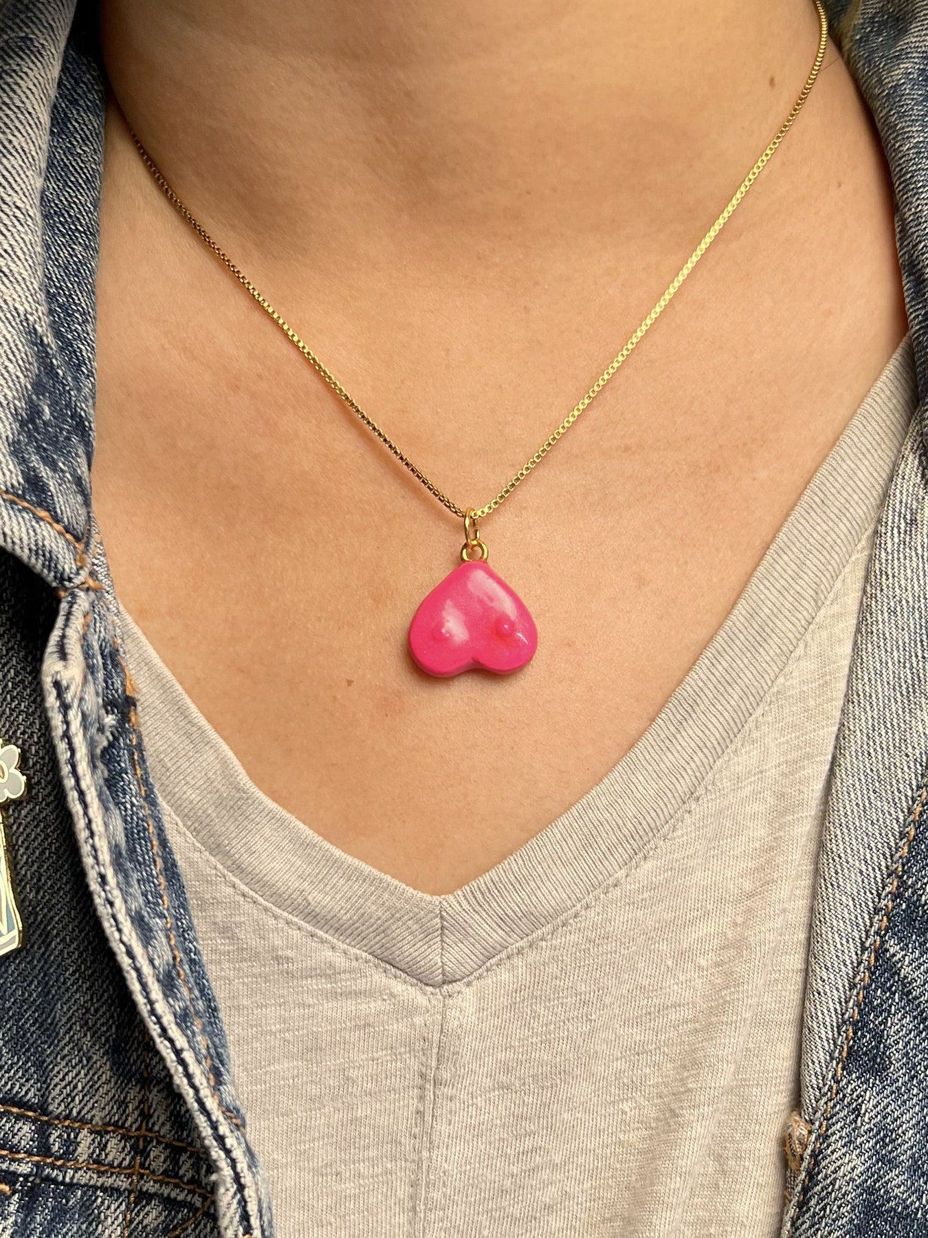 The "Heart Boob" charm is a handmade, hand-painted item inspired by the creator’s breast cancer journey. It is available in two colors: pink with shimmer or gold metallic.