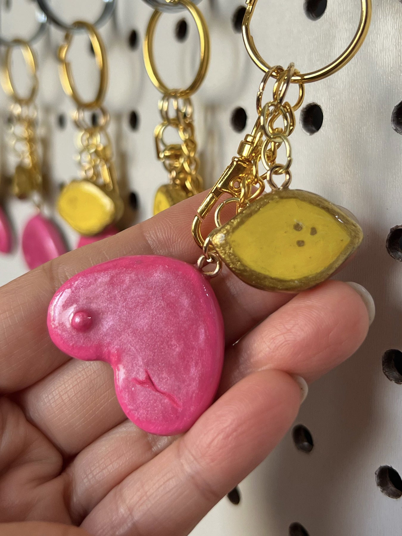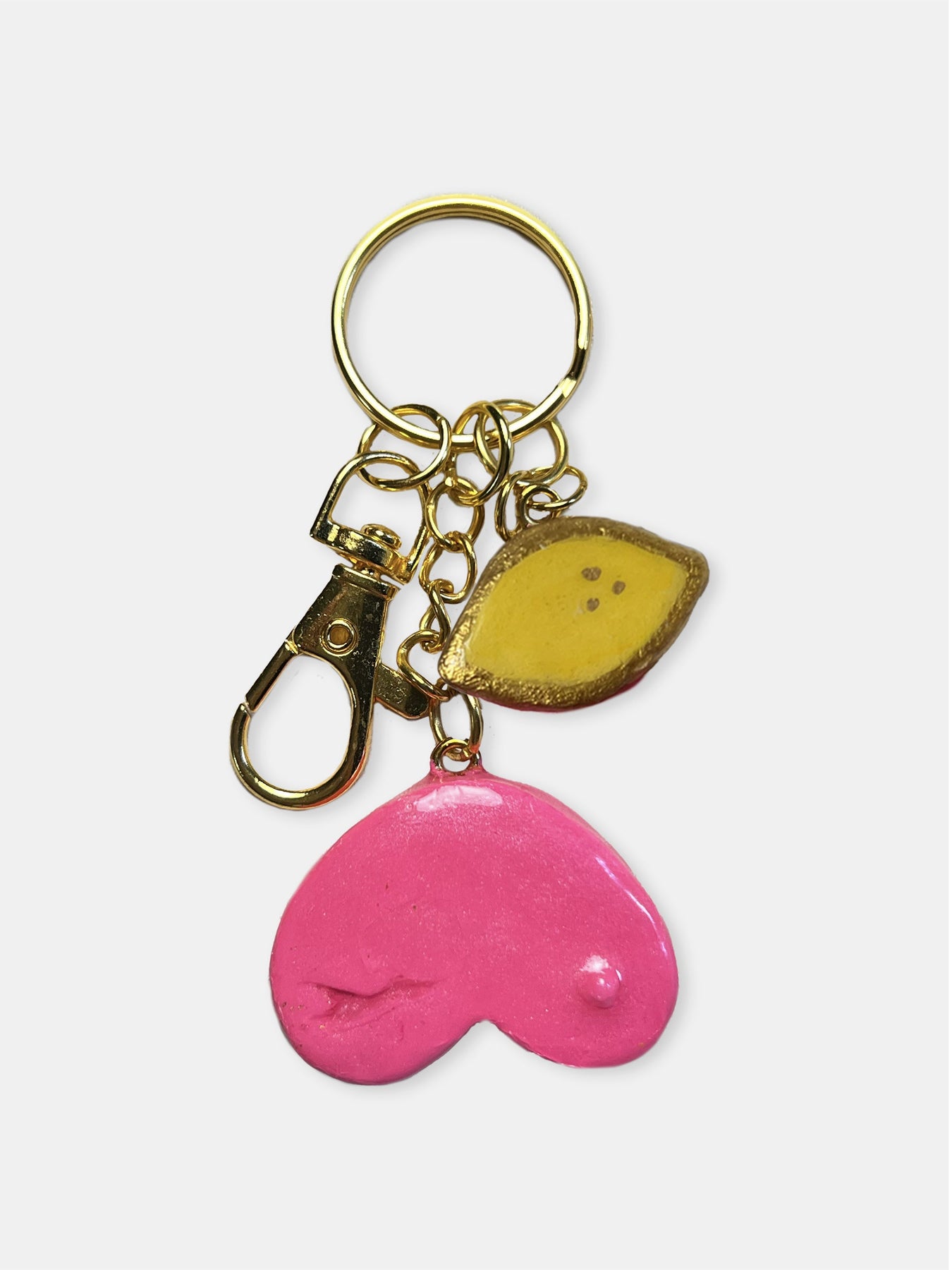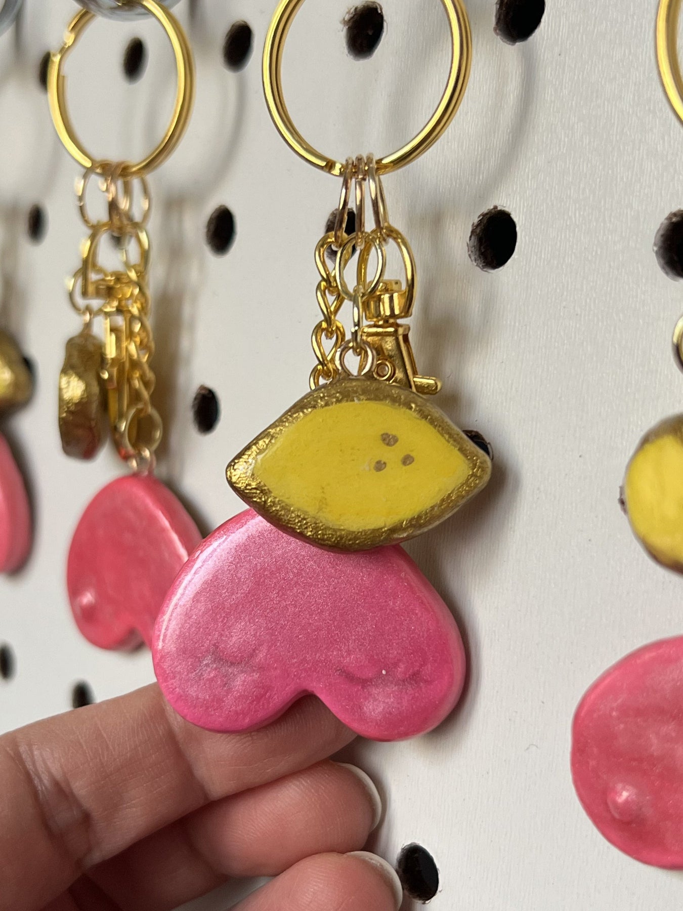 This keychain features charming heart boobs and lemon designs, all handmade and hand-painted for a unique touch. The single or double scars on the heart charm symbolize resilience, and represent strength through adversity.