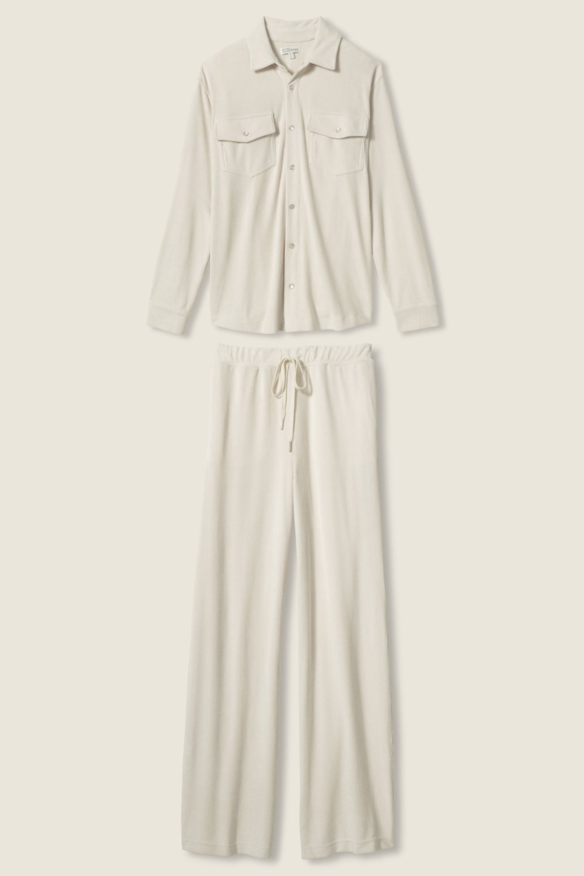 The Craving Corduroy Lounge Set is soft, stretchy, and retro-inspired. Crafted in plush velour corduroy, this neutral two-piece includes a button-up top with chest pockets and matching wide-leg pants with a drawstring waist—bringing vintage charm to everyday comfort.