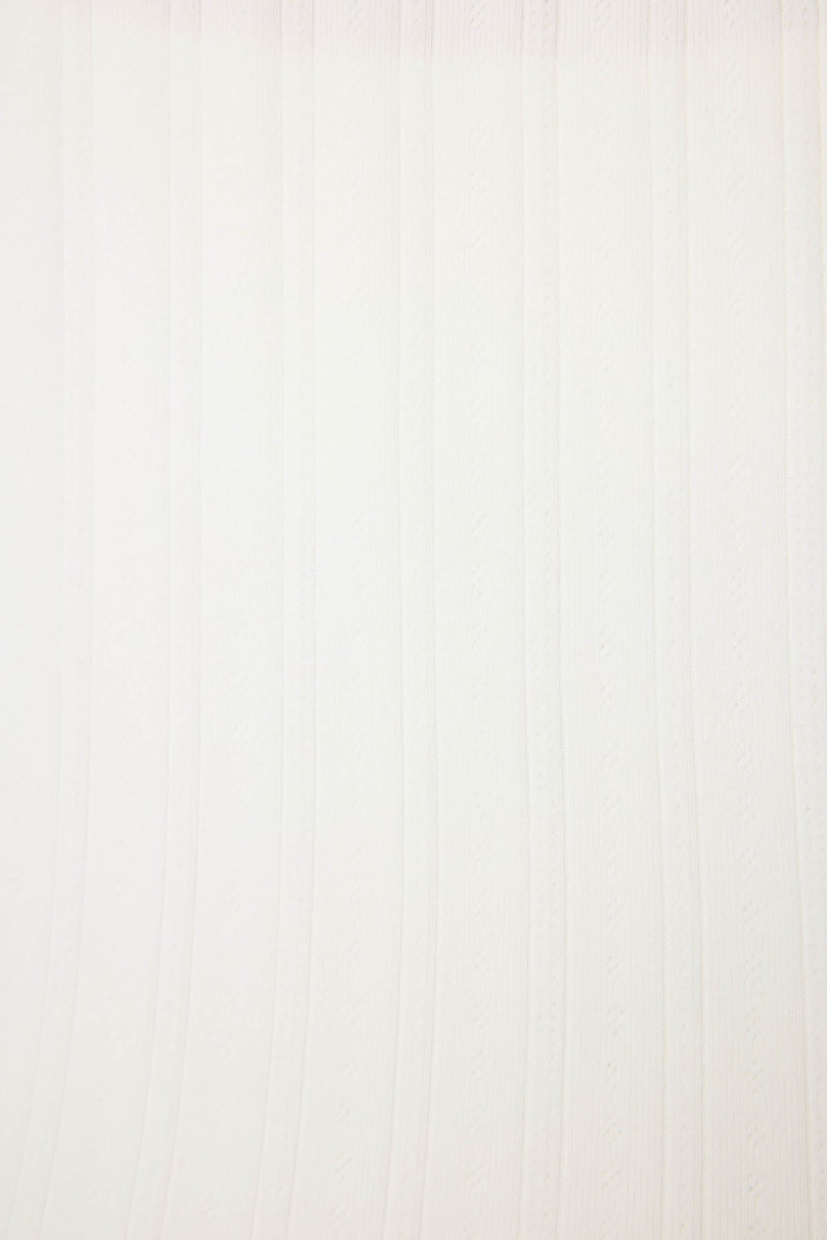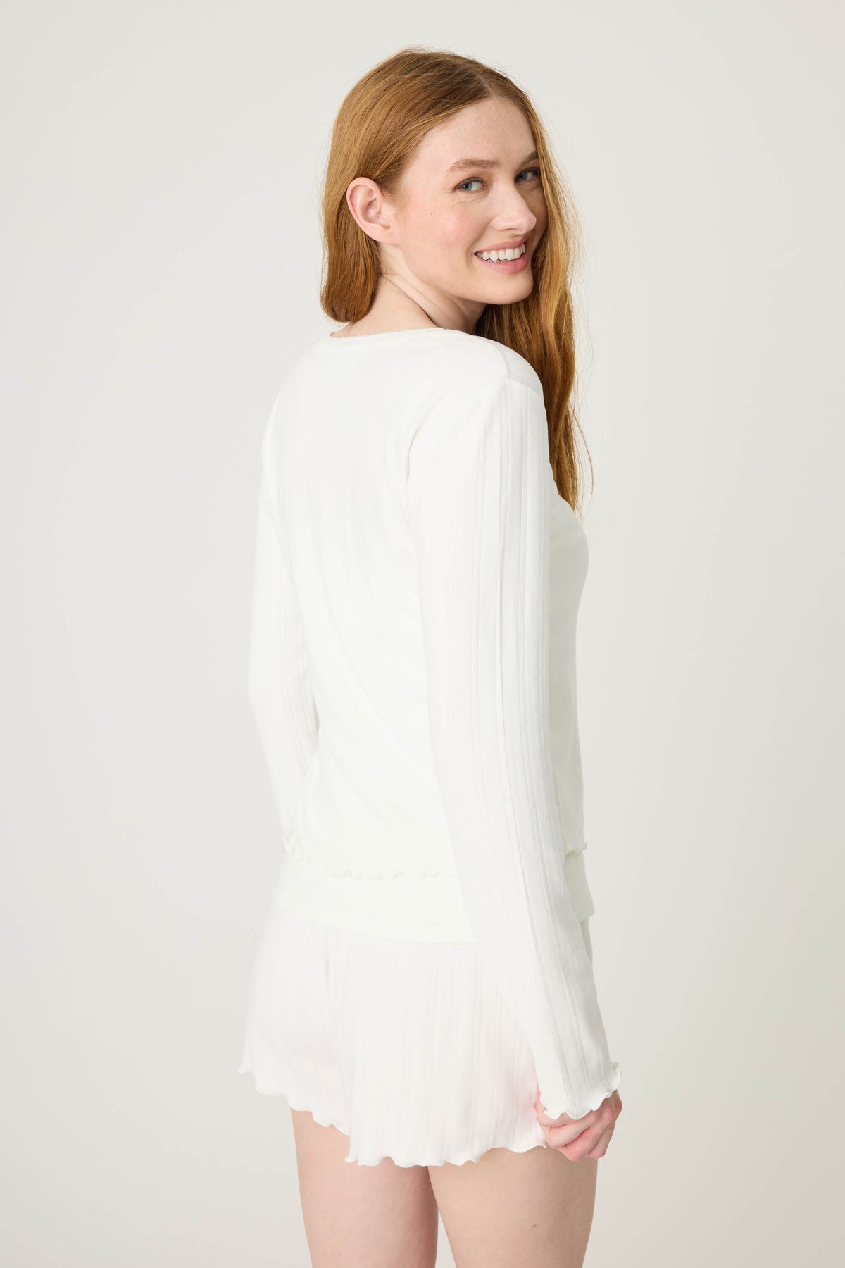 The Pointelle Essentials Cardigan is fitted, feminine, and timeless. Made from double-brushed pointelle fabric in soft ivory, it features a delicate V neckline, scalloped trim, and dainty lettuce-edge sleeves for a vintage-inspired finish.
