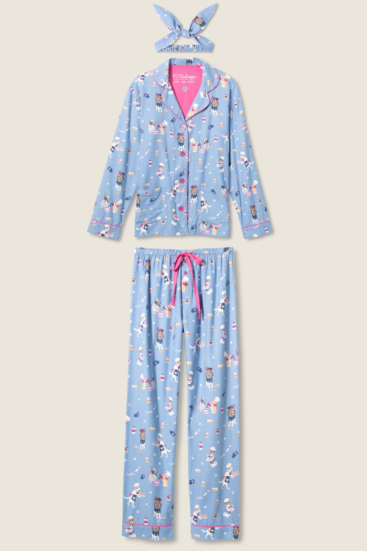 The Baked Woof Love Flannel PJ Set is cozy, playful, and made to delight. Crafted from soft cotton twill, this three-piece includes a button-up shirt, relaxed-fit pants, and a matching headband. The soft blue fabric is covered with pups baking cupcakes, playful paw prints, and kitchen doodles for a whimsical bedtime look.