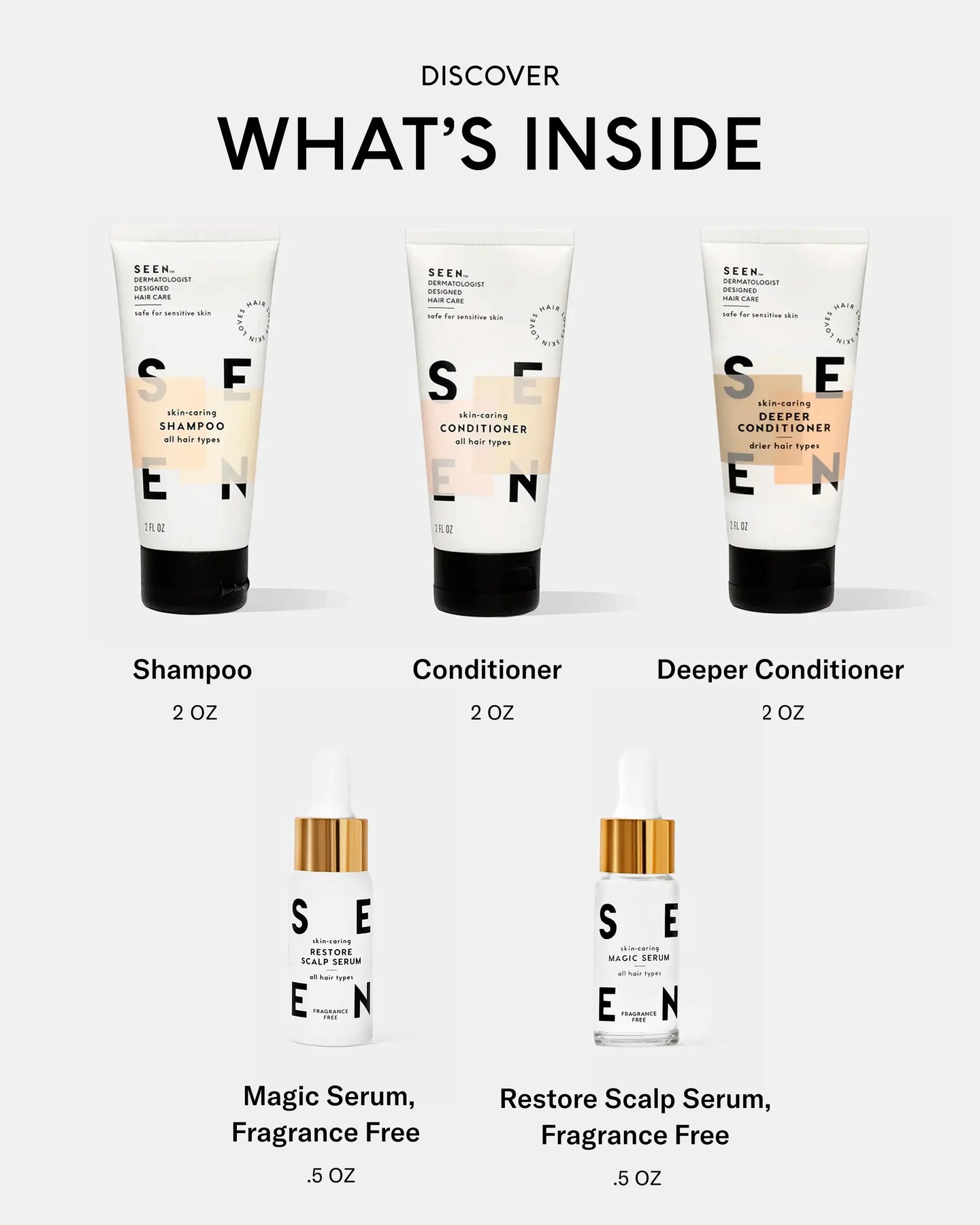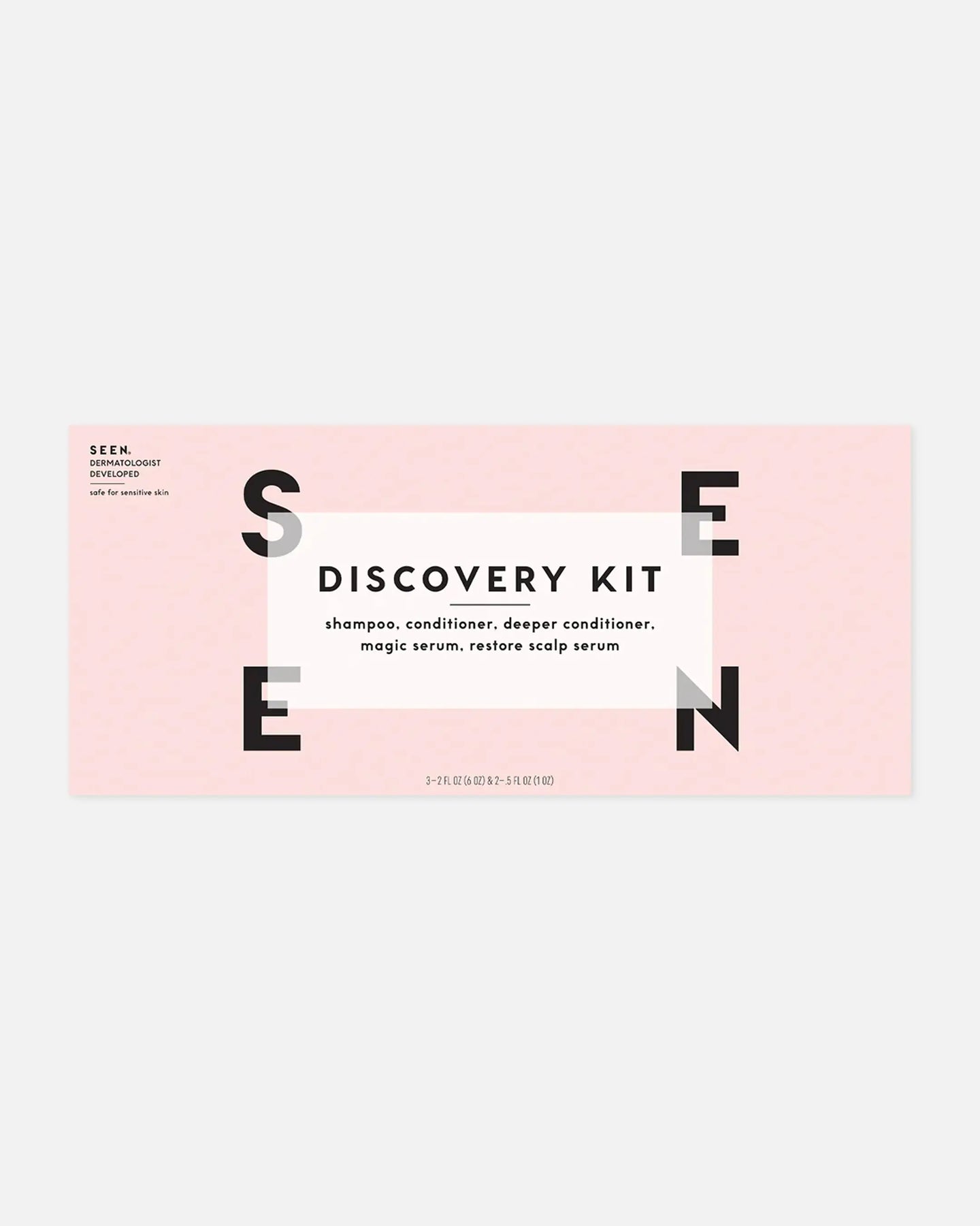 The SEEN Discovery Kit features Shampoo (2 oz.), Conditioner (2 oz.), Deeper Conditioner (2 oz.), Magic Serum (.5 oz.), and Restore Scalp Serum (.5 oz.)