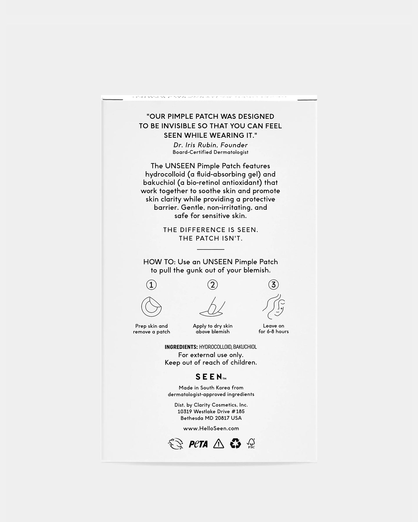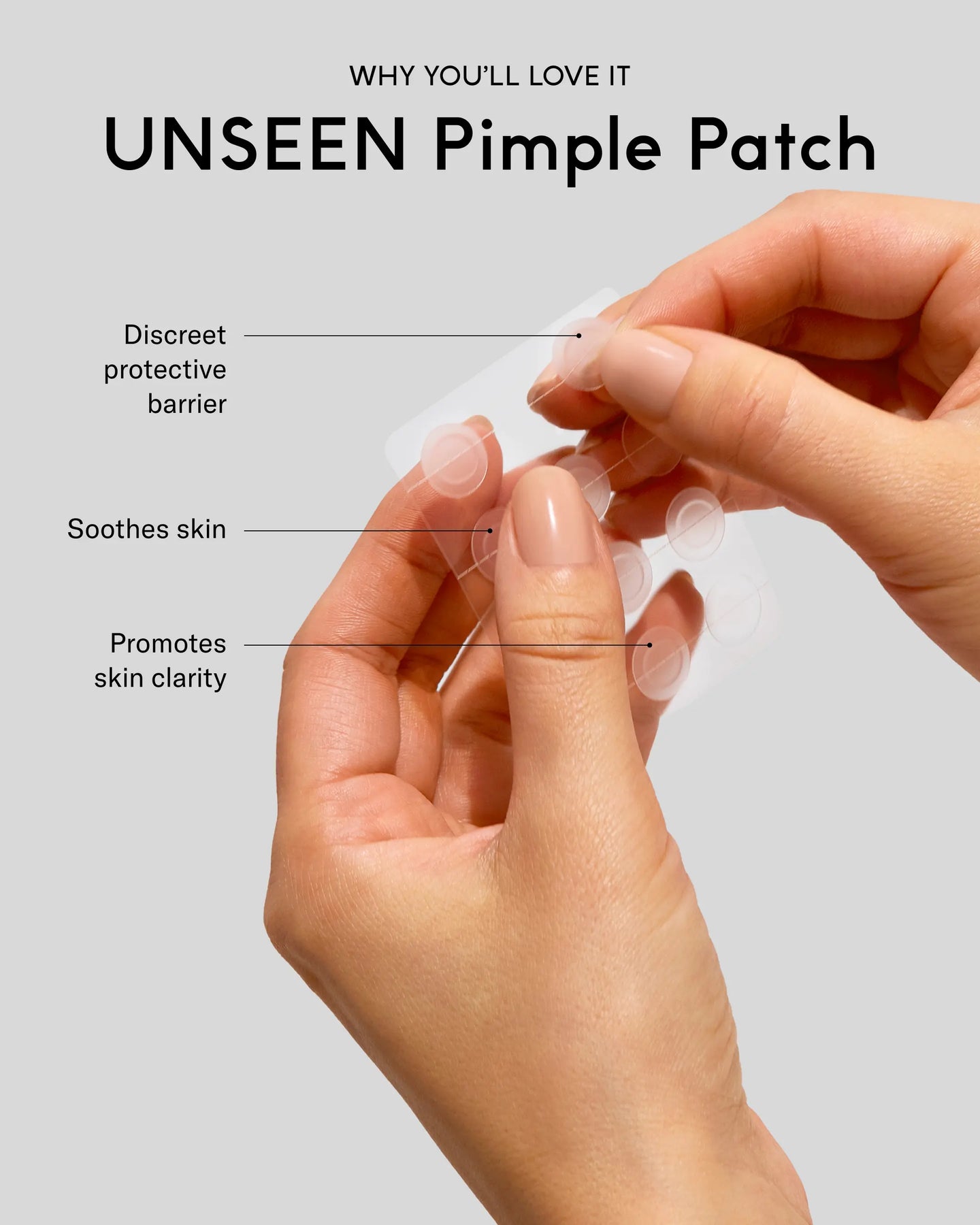 The UNSEEN Pimple Patch features hydrocolloid (a fluid-absorbing gel) and bakuchiol (a bio-retinol antioxidant) that work together to soothe skin and promote skin clarity.