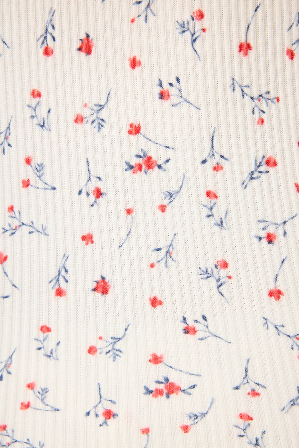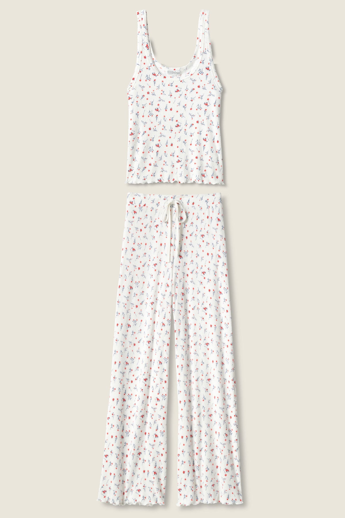 The floral print pj set is sweet, soft, and endlessly cozy. Crafted from brushed rib with a hint of stretch, this ivory two-piece blooms with a delicate rose print and includes a scoop-neck cami paired with wide-leg drawstring pants for an easy, coordinated look.
