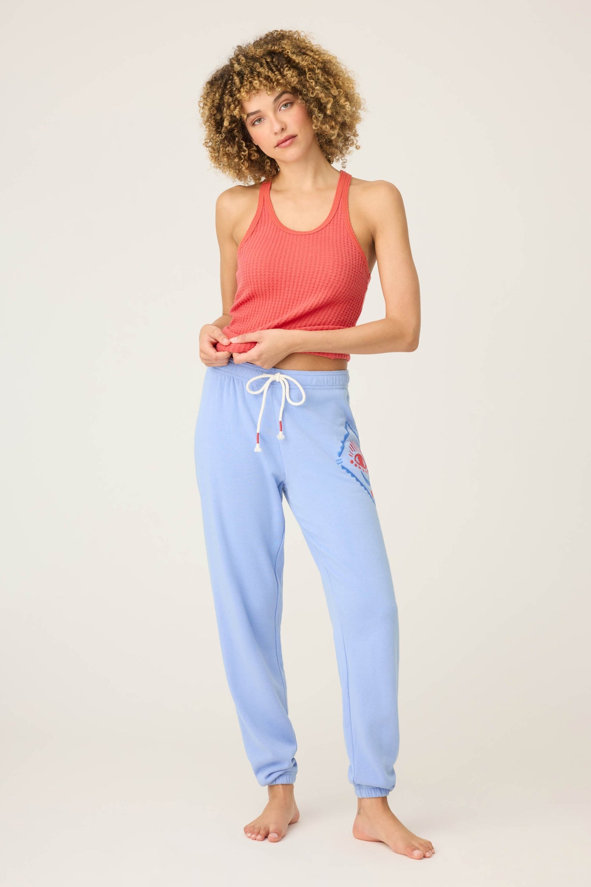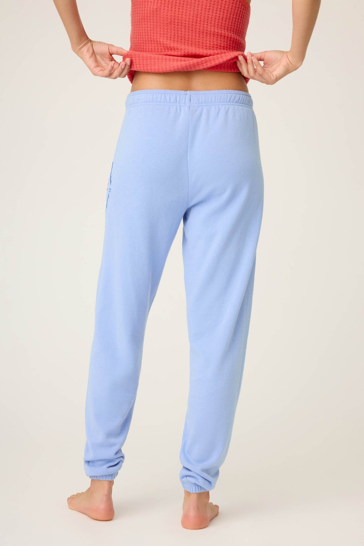 The Lucky Me Lounge Pants are cozy, whimsical, and designed with comfort in mind. Made from soft periwinkle fleece, they feature a relaxed fit with a drawstring waist, elastic cuffs, and embroidered symbols—a protective eye, crescent moon, star, and heart—for a touch of charm.