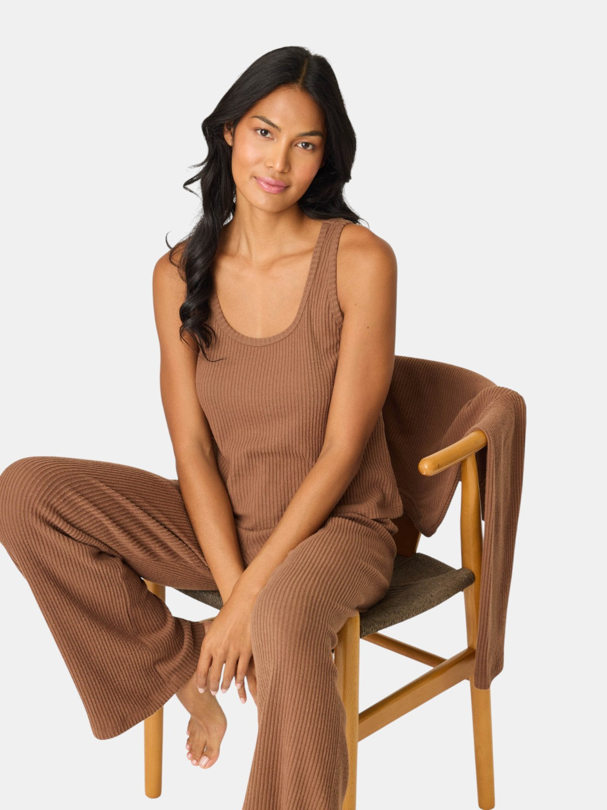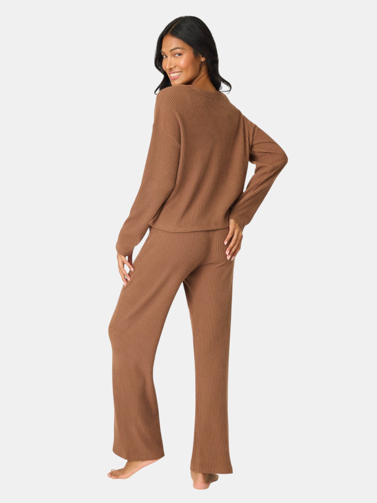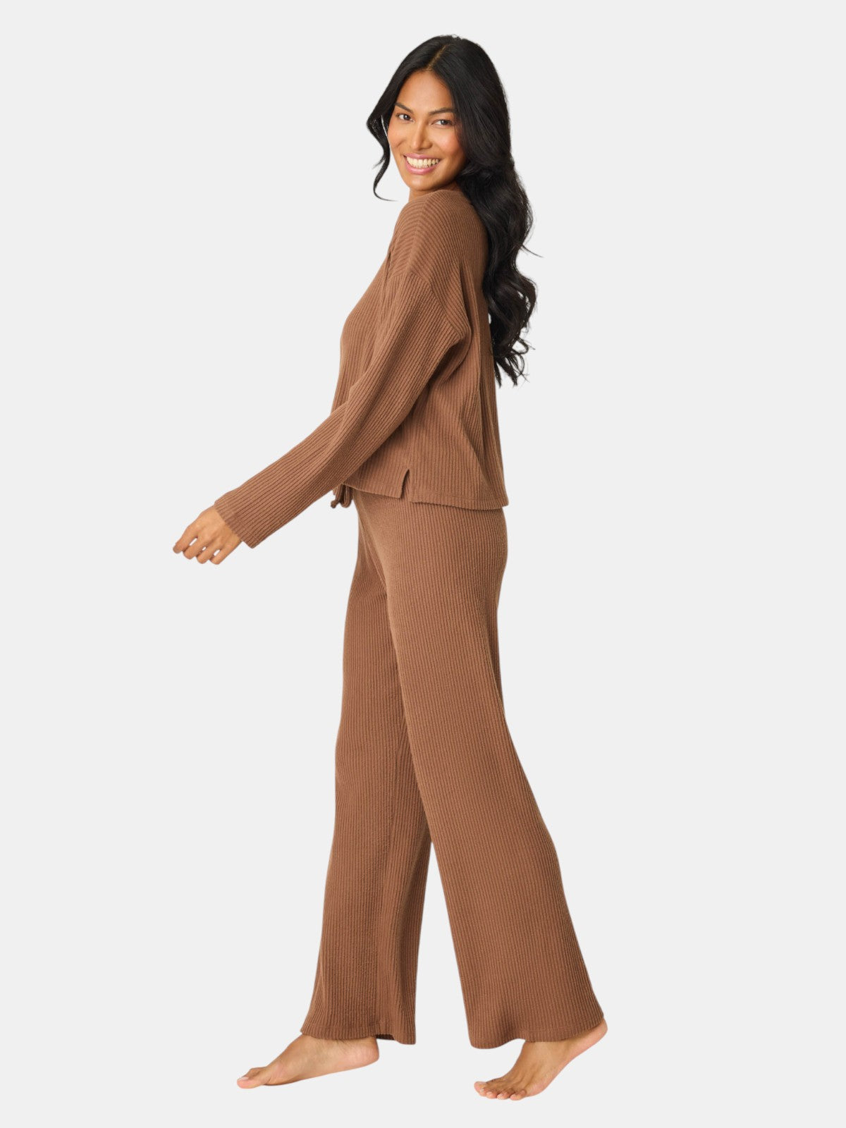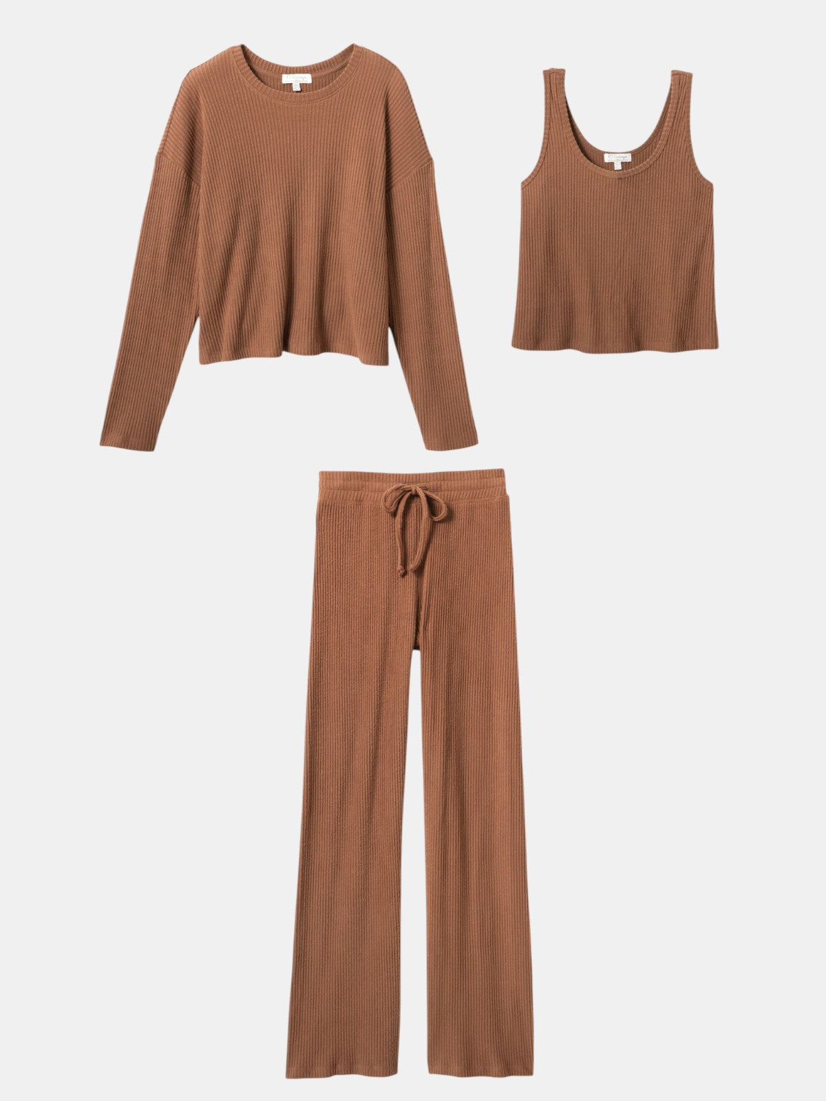 The 3-Piece Luxe Ribbed Brown PJ Set is a three-piece lounge set in ultra-soft rib knit. The light brown hue brings cozy warmth to a coordinating scoop-neck tank, long-sleeve top, and relaxed wide-leg pants. Perfect for holiday movie marathons, wrapping gifts, and cozy nights in.
