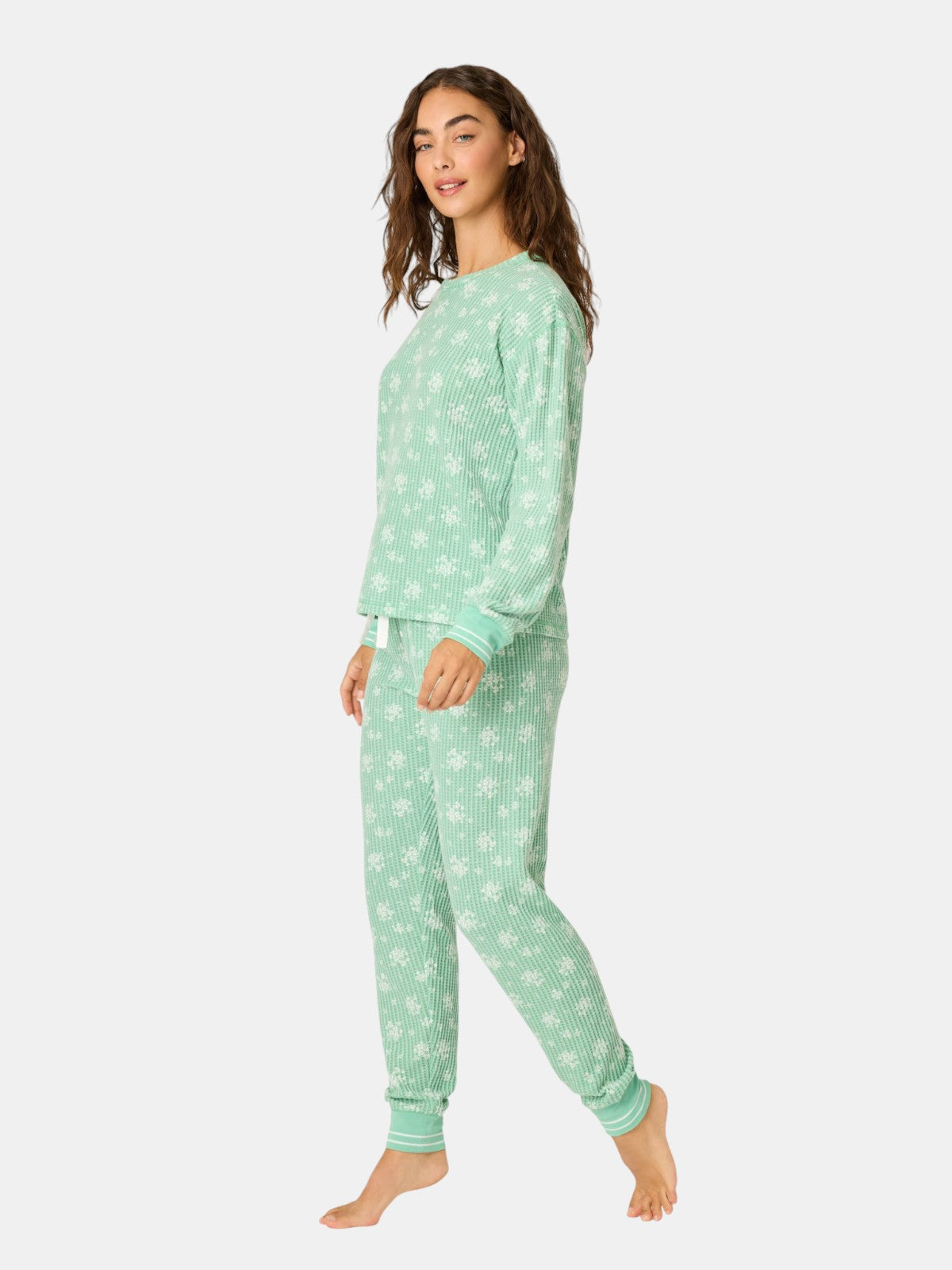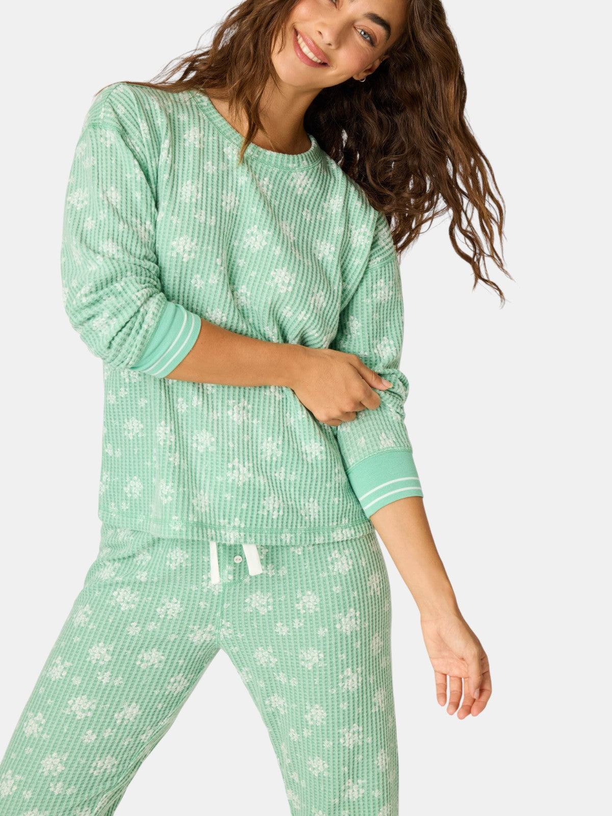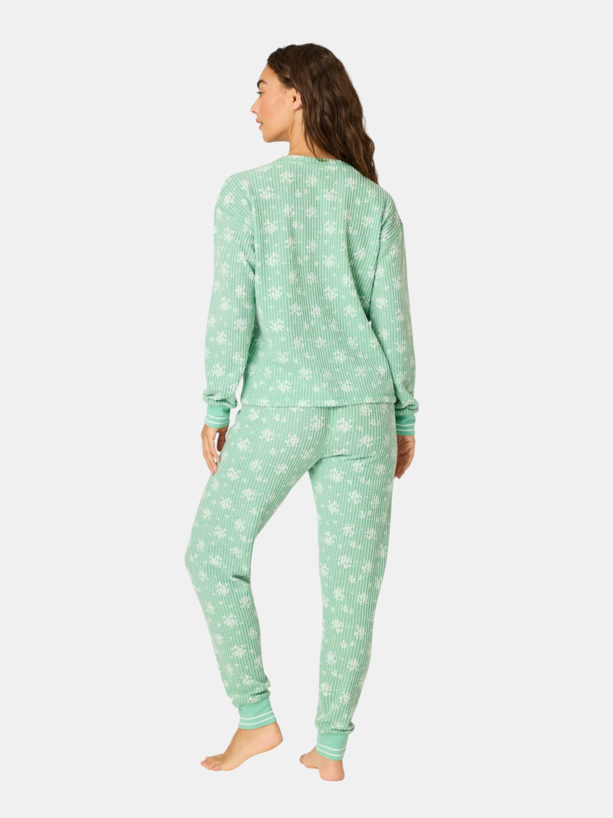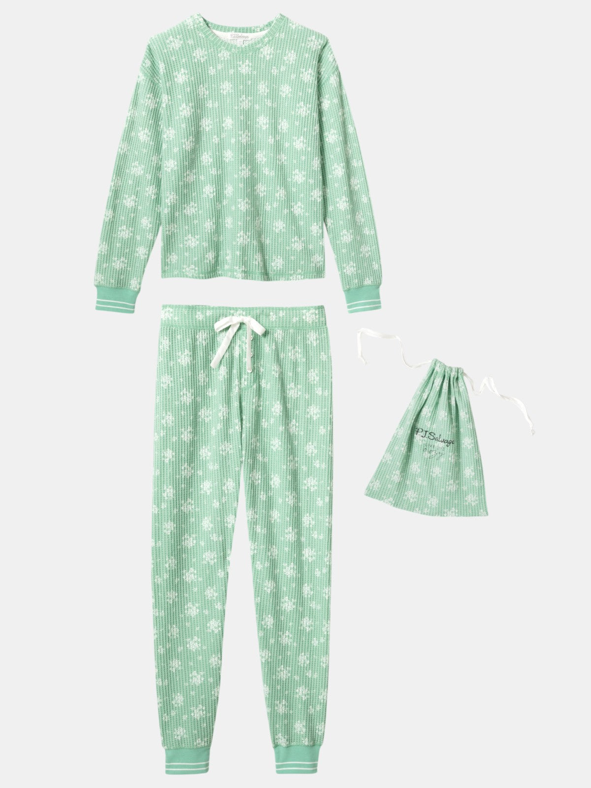 The 3-Piece Snowflake Print Velour PJ Set is a floral-print pajama set in plush thermal velour. A crisp white bloom pattern covers the long-sleeve top and relaxed drawstring pants, while the matching bag makes it a ready-to-wrap holiday treat.