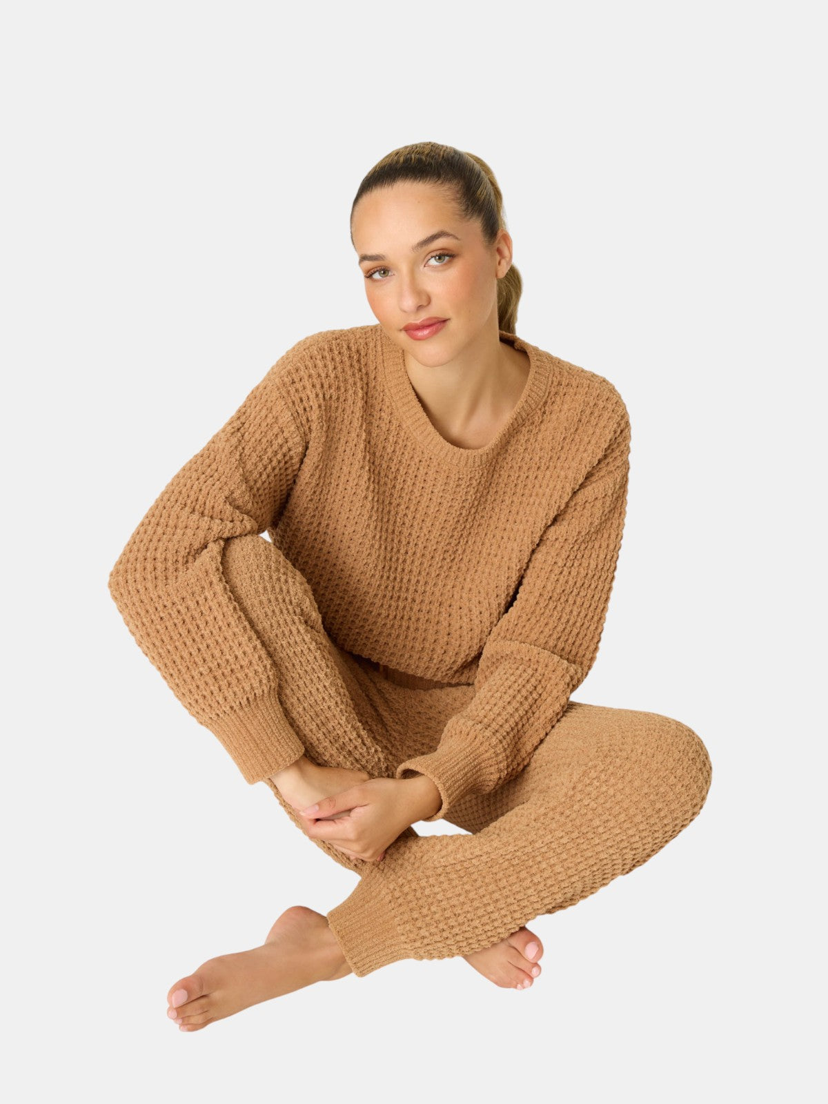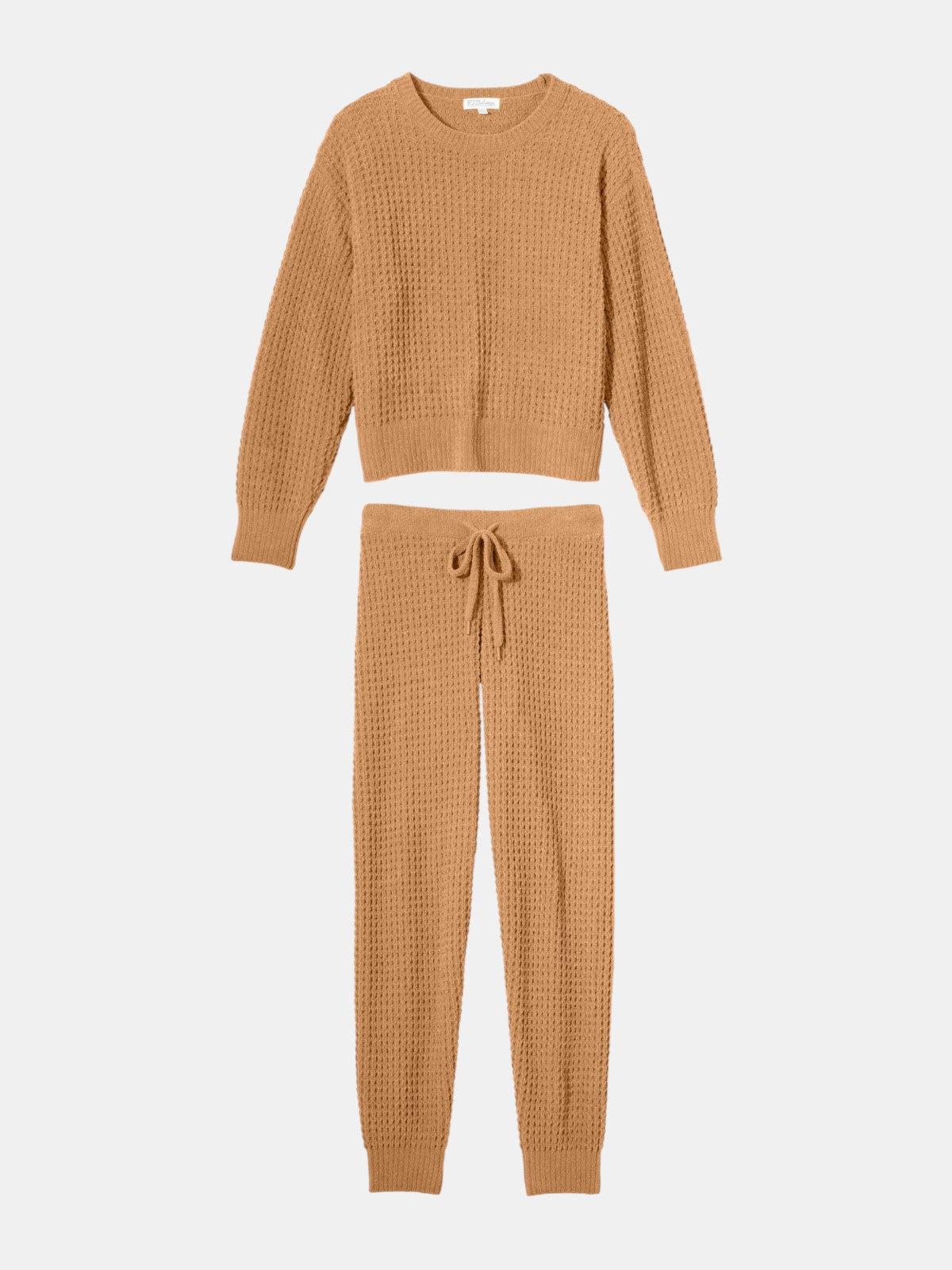 Soft, textured, and built for endless cozy moments, this chenille waffle set is a cold-weather constant. The crewneck top drapes in a relaxed fit with cuffed sleeves and hem for that snug-but-slouchy feel, while the jogger pants cinch at the waist and taper to cuffed ankles for around-the-clock comfort. Done in a warm tan hue, it’s the set you’ll reach for on repeat—whether curling up with a book, brewing a second cup of coffee, or riding out the chilly months in style.