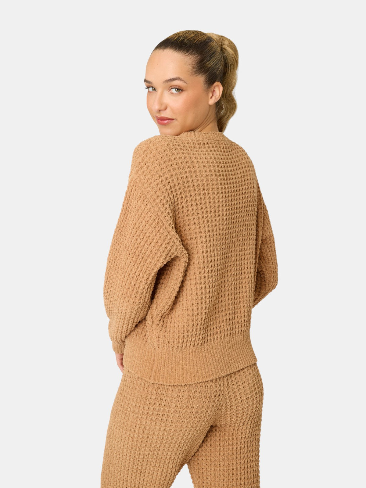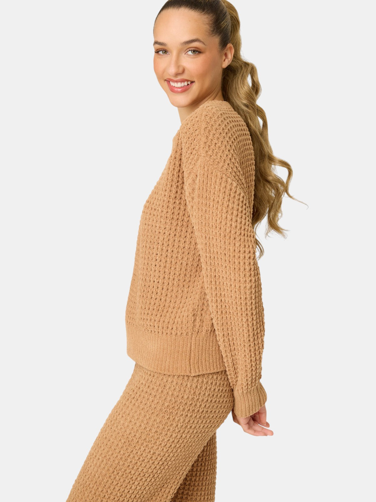 The Chenille Waffle Caramel Lounge Set is plush, cozy, and irresistibly soft. Designed in chenille with a classic cable knit texture, it pairs a relaxed V-neck pullover with matching drawstring pants for the ultimate stay-home set.