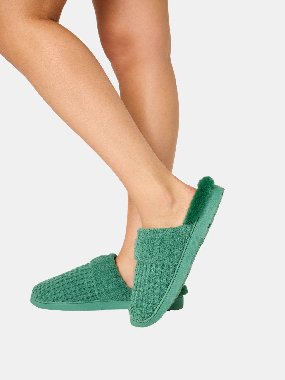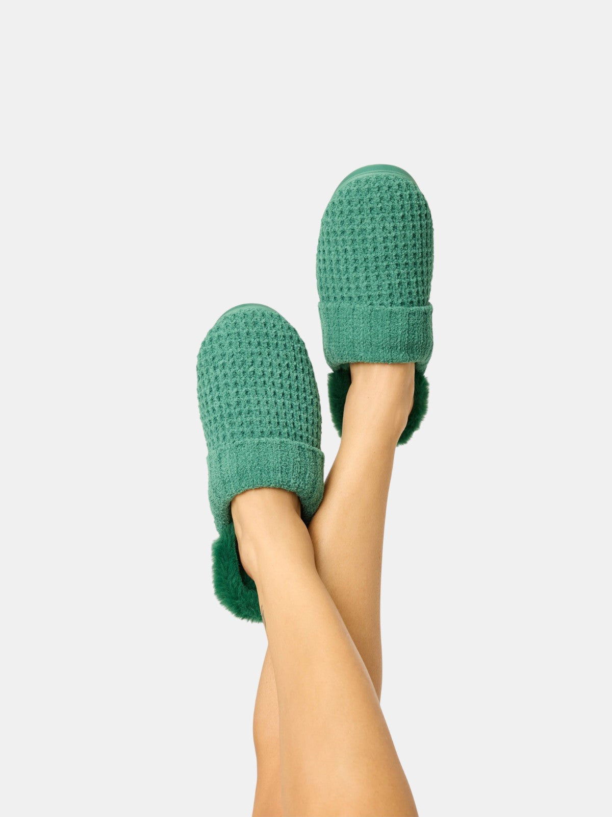 The Chenille Waffle Cozy Slippers are forest-green slides crafted from cozy chenille waffle knit with a soft faux-fur lining and sturdy sole.