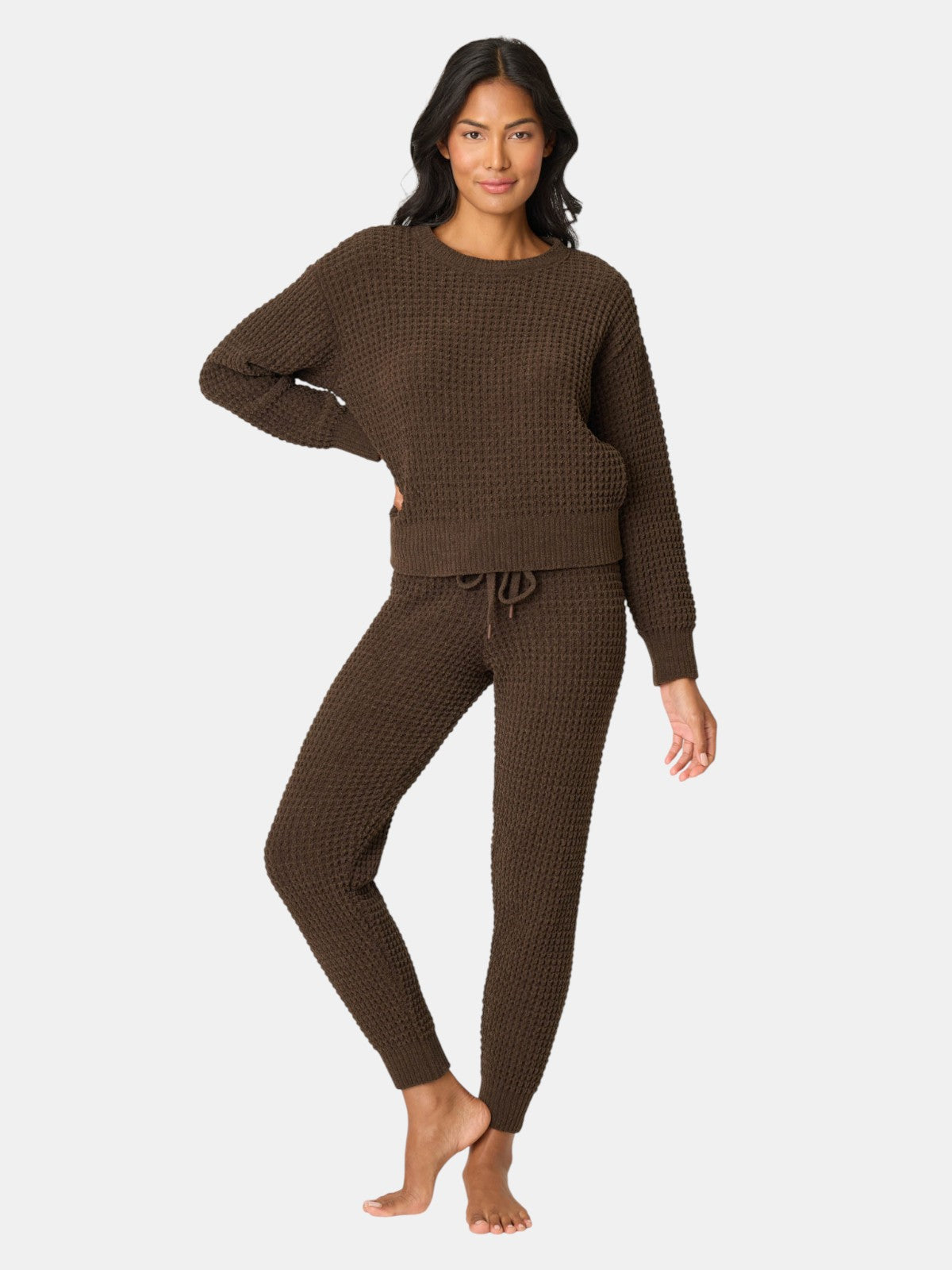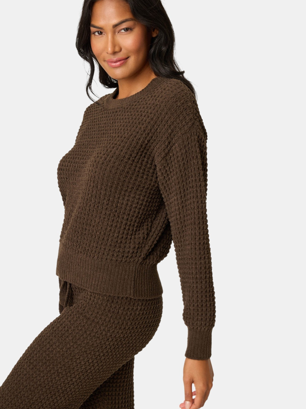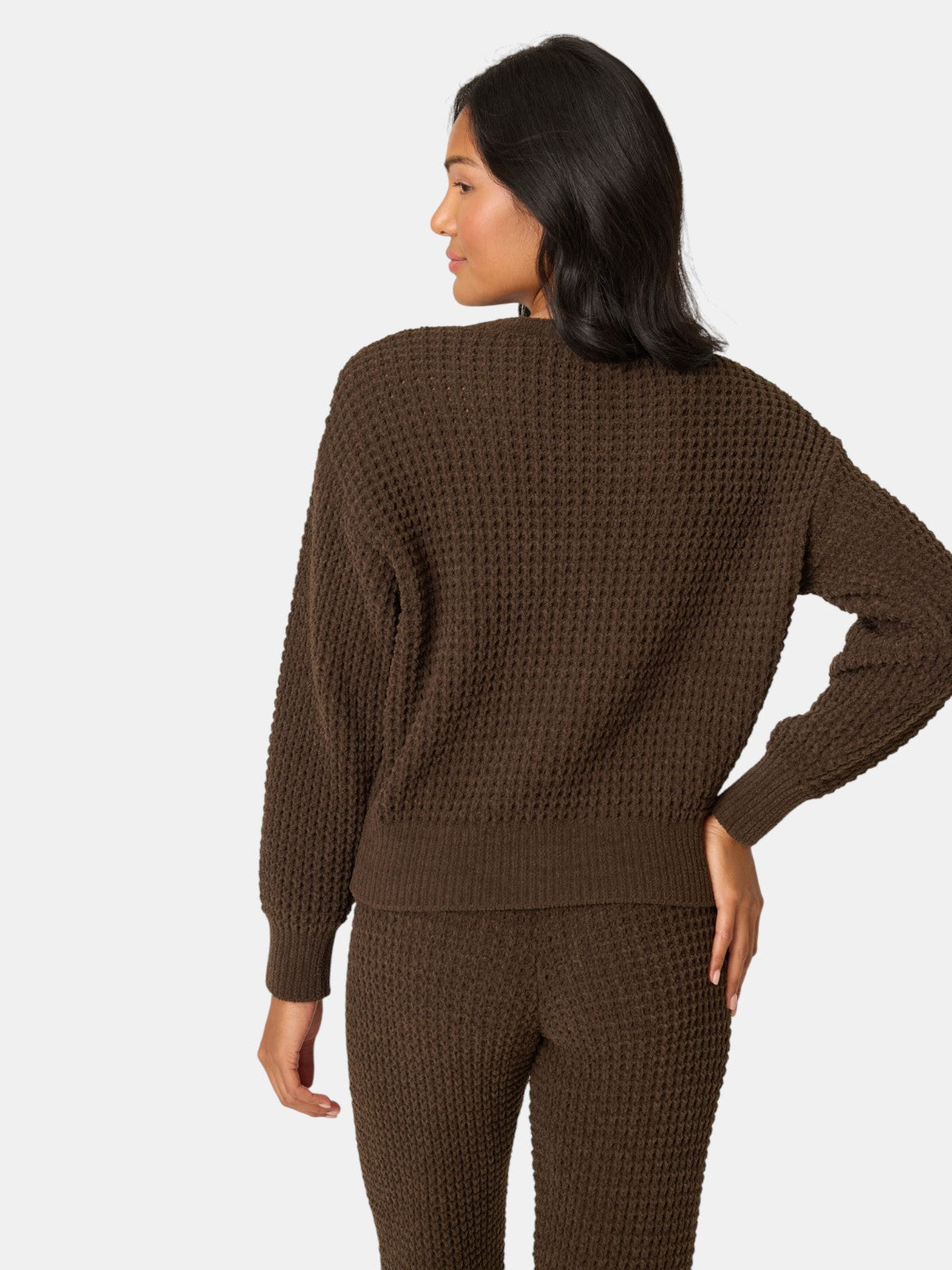 The Chenille Waffle Long Sleeve Chocolate Top is plush, cozy, and irresistibly soft. The top is crafted from plush chenille waffle in a rich chocolate brown hue. Designed with a relaxed fit, classic crew neckline, and banded cuffs, it locks in comfort while keeping things laid-back.