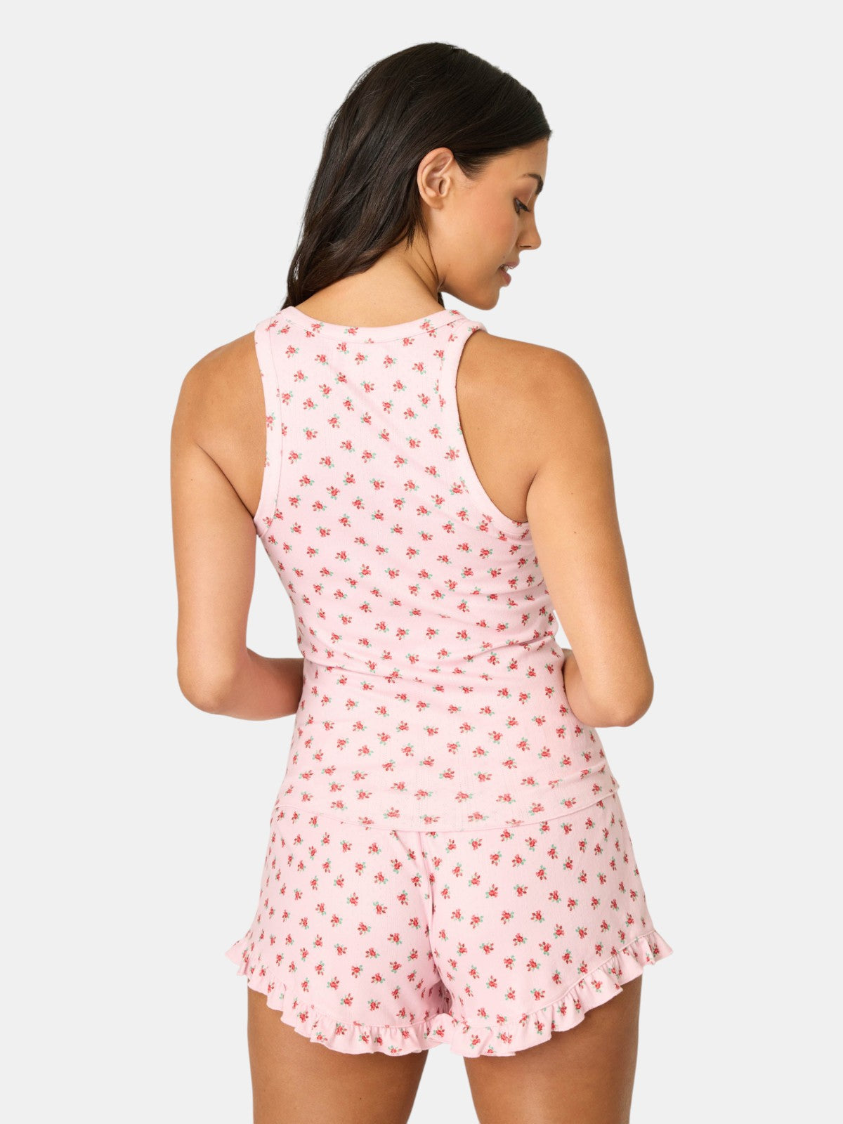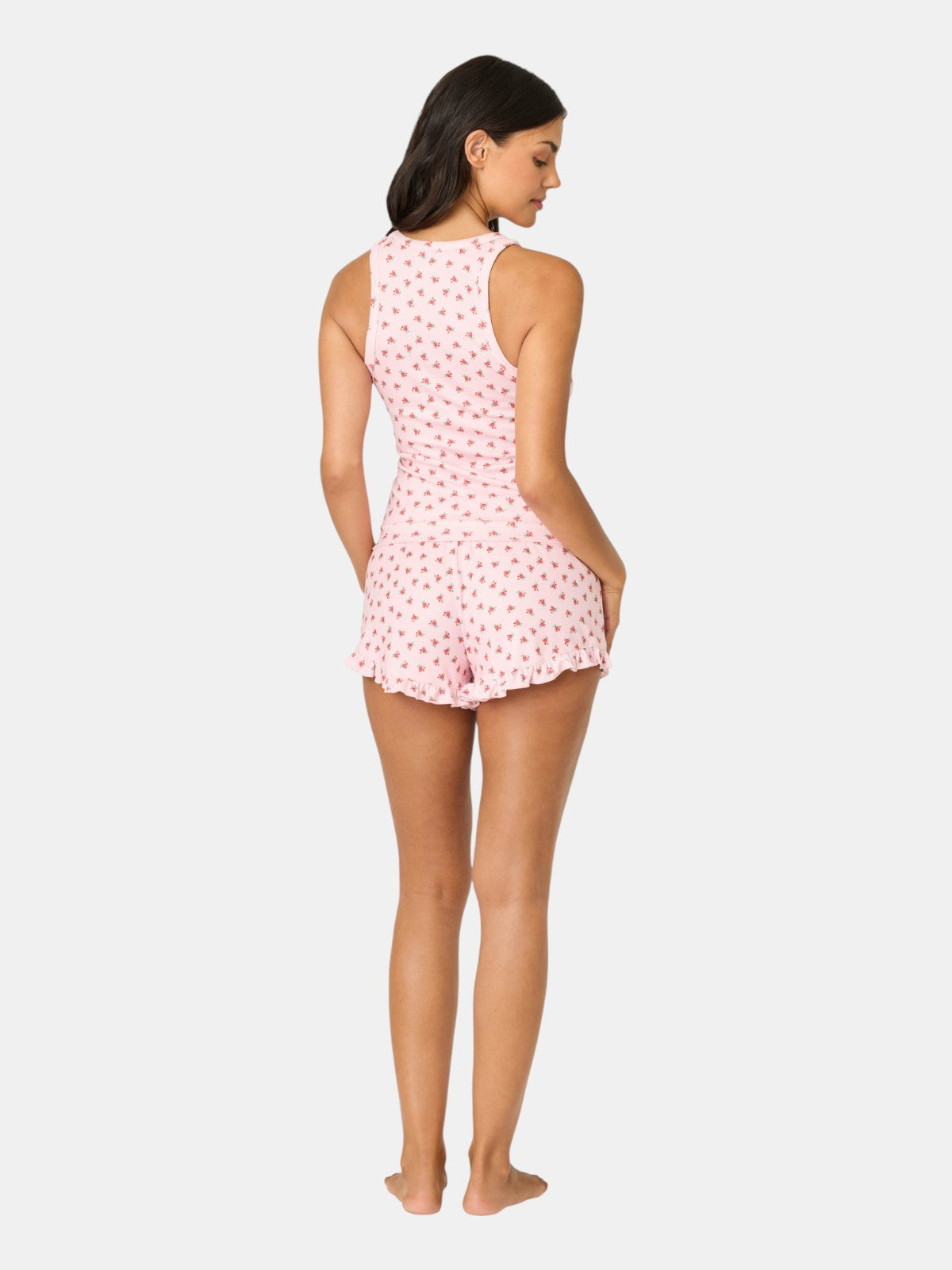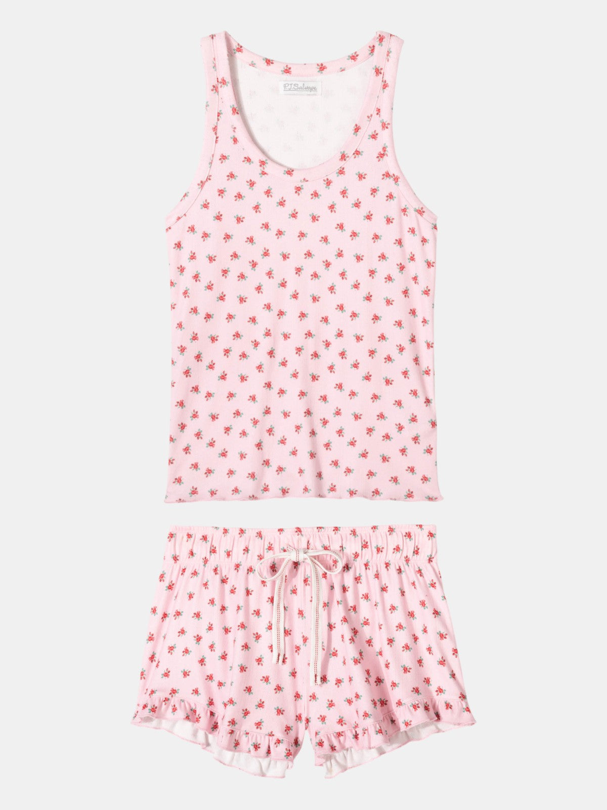 The Crazy For The Holidays Ditsy Floral Print Shorts Set is a pink pointelle pajama set, styled with a ditsy floral tank and drawstring shorts. With a scoop neckline and ruffle trim, it’s sweet, playful, and cozy enough for festive mornings.