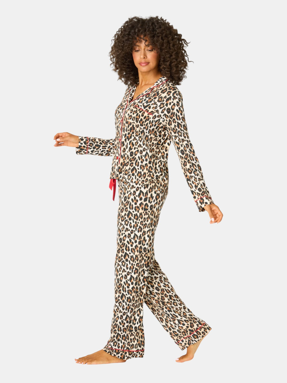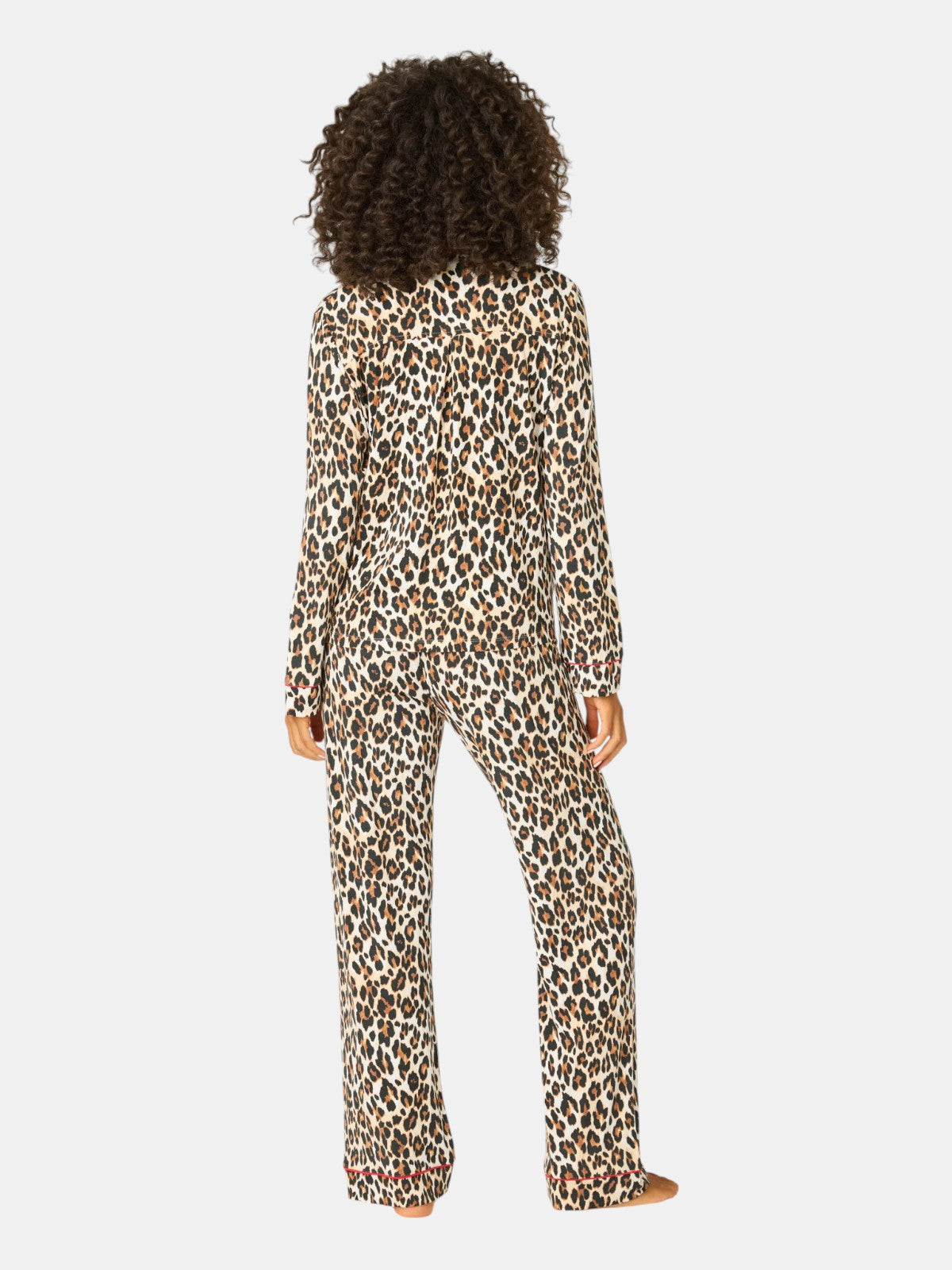 The Holiday Dreams Leopard Print Pants Set is a modal jersey pajama set, patterned all over in leopard spots. The button-down top is finished with red piping and buttons, while the relaxed drawstring pants tie with a matching red ribbon—an easy way to add a fierce twist to cozy nights in.