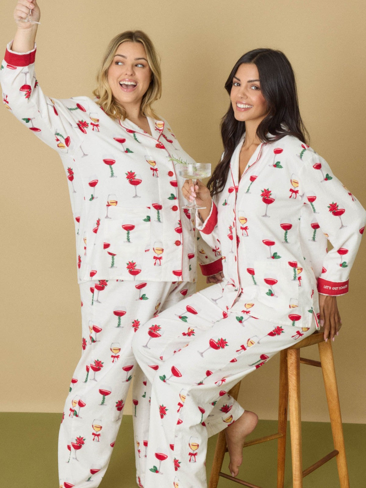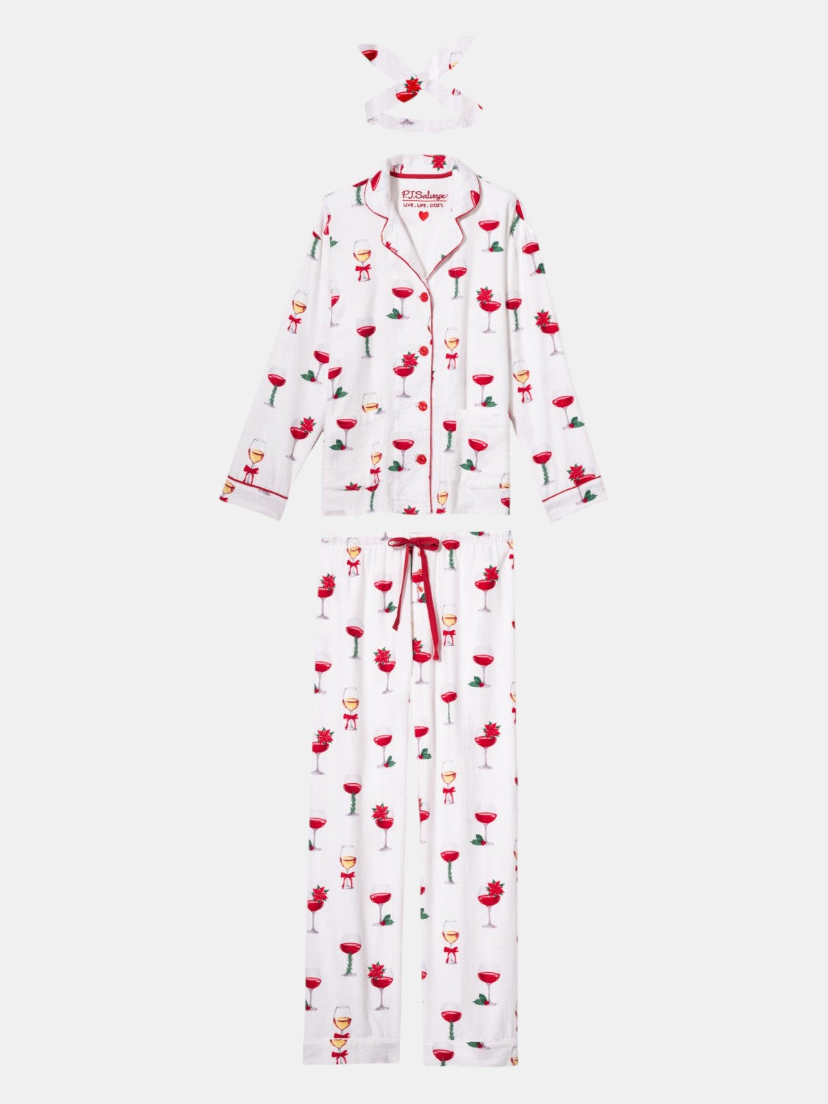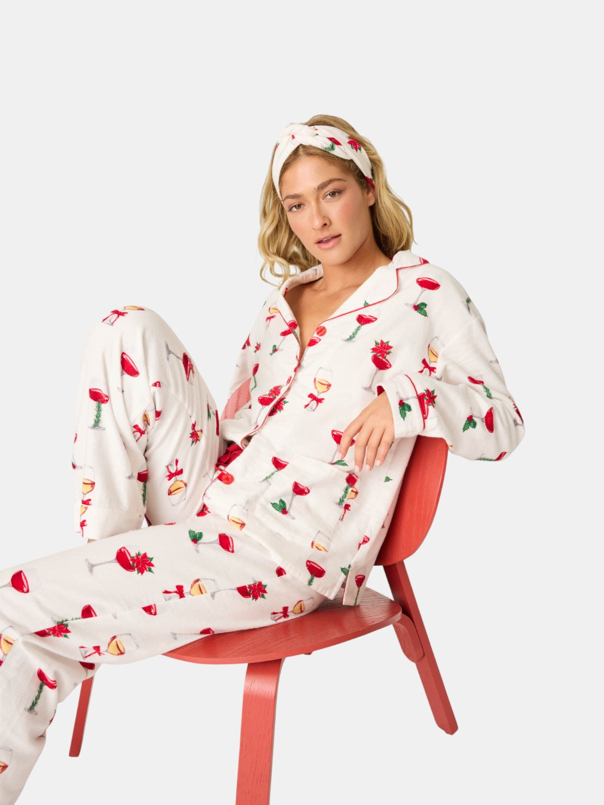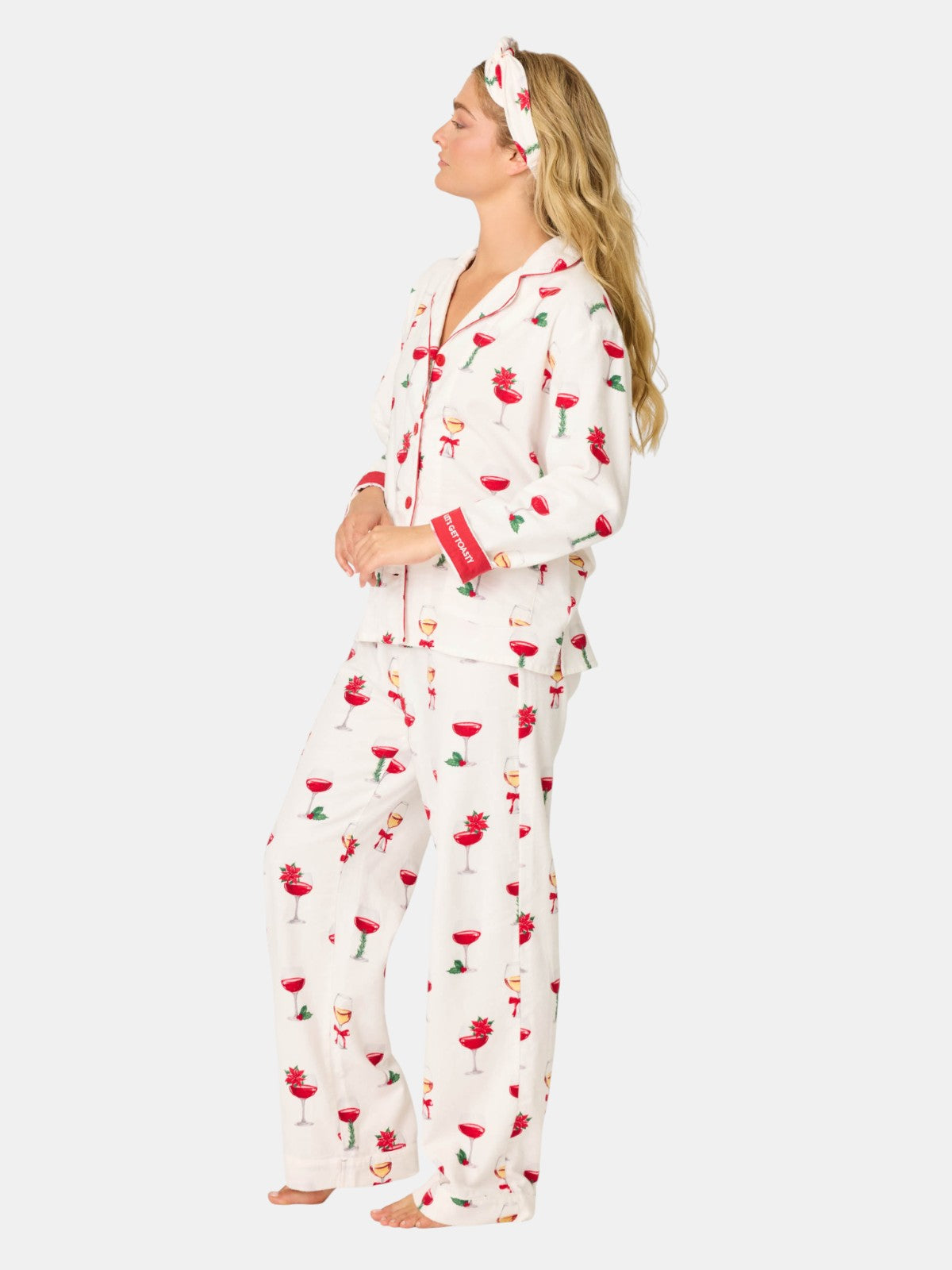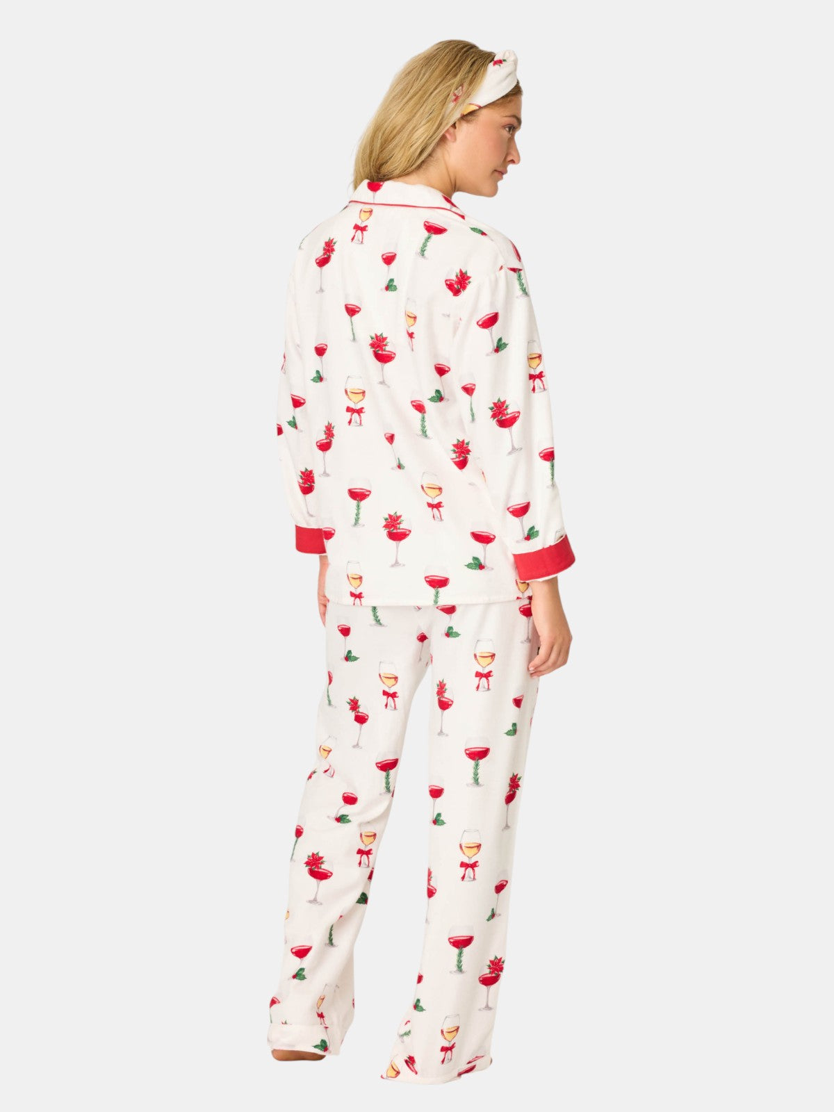 The Let's Get Toasty 3-Piece Print Flannel PJ Set is an ivory cotton flannel pajama set, patterned with festive wine glasses topped with poinsettias, bows, and sprigs of holly. This plus-size three-piece design includes a button-down top finished with red piping, relaxed drawstring pants, and a matching headband—perfect for holiday happy hours, wrapping marathons, and fireside lounging.