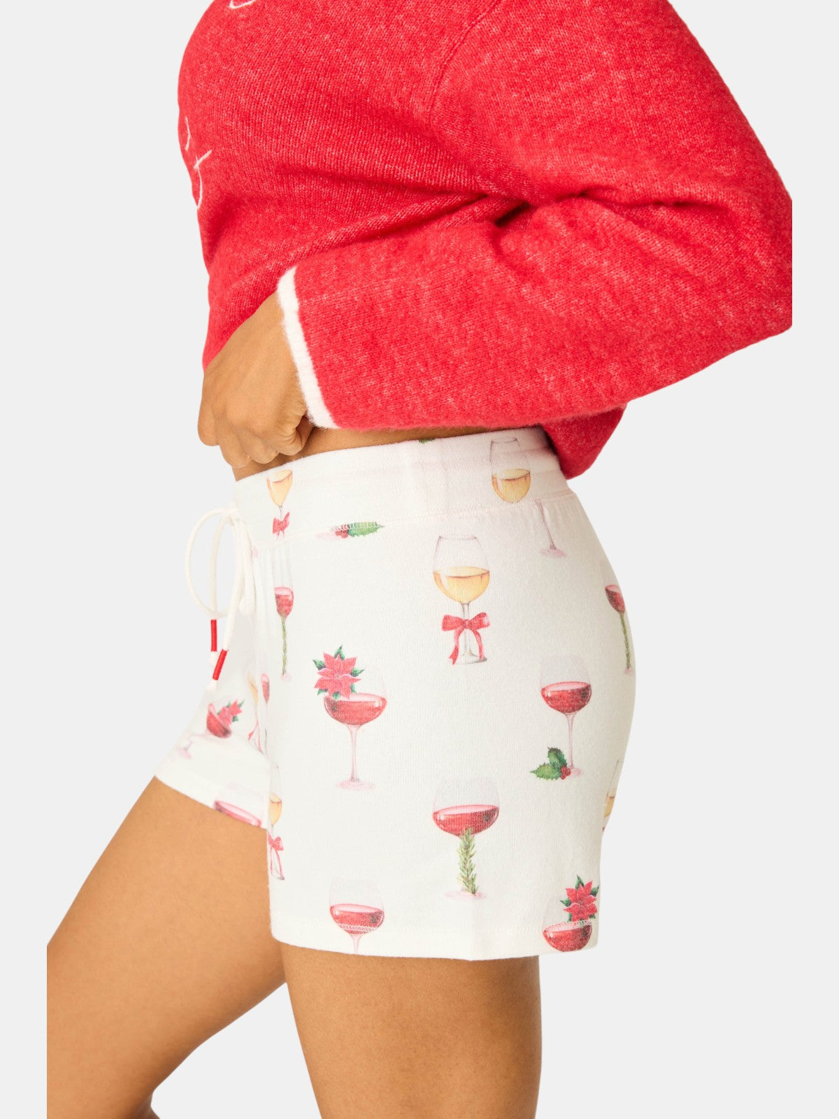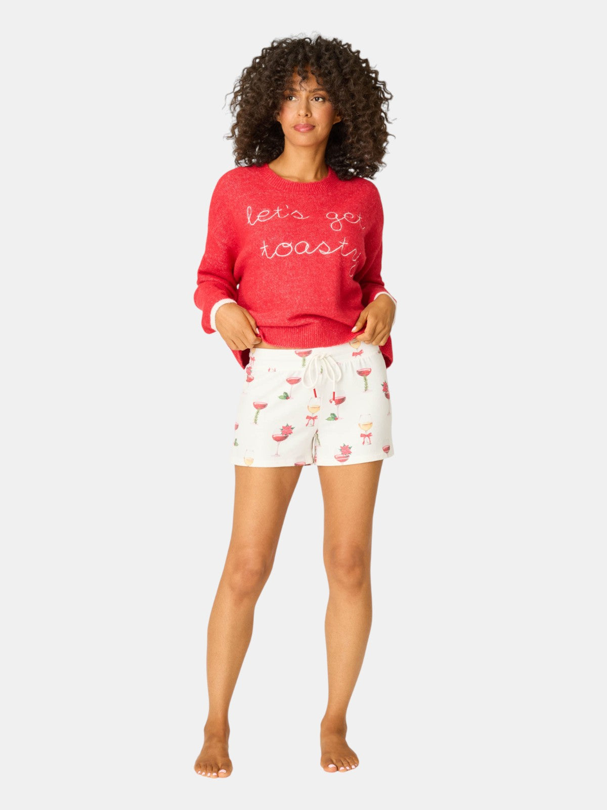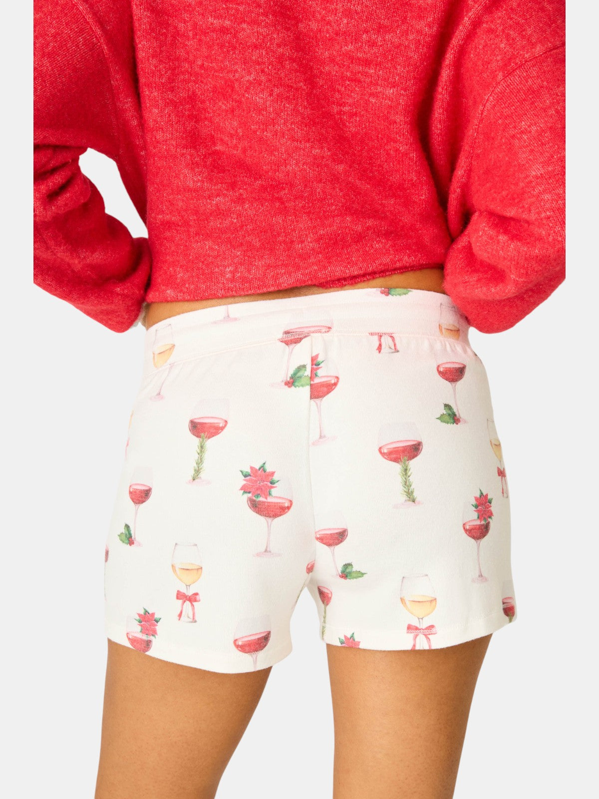 The Let's Get Toasty Holiday Wine Print Shorts are ivory pajama shorts, scattered with festive champagne glasses. Cut in a peachy jersey, they feature a relaxed fit and adjustable drawstring waist—perfect with the matching tank or long sleeve for holiday lounging.