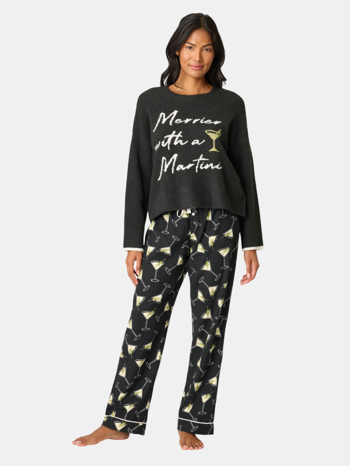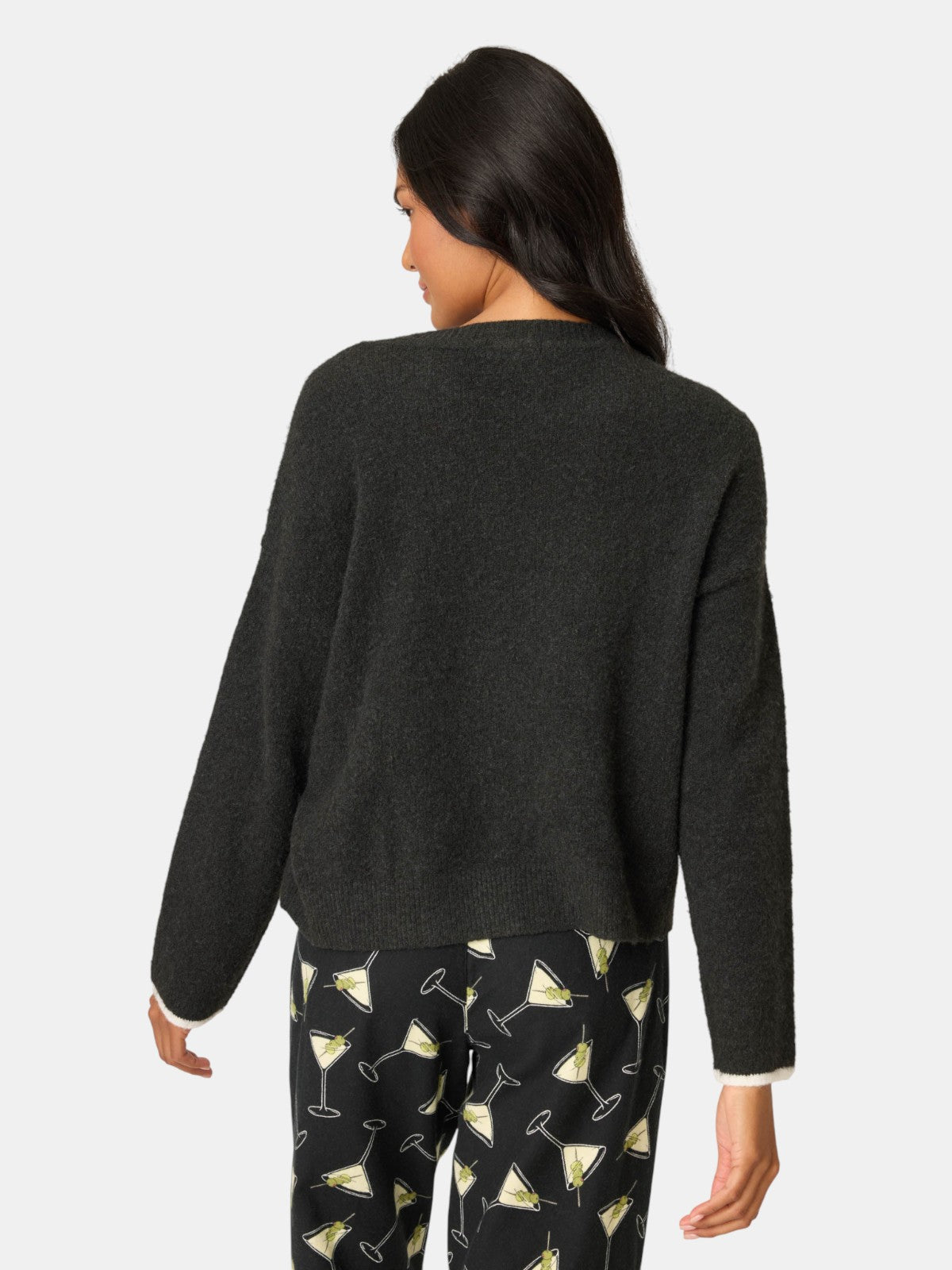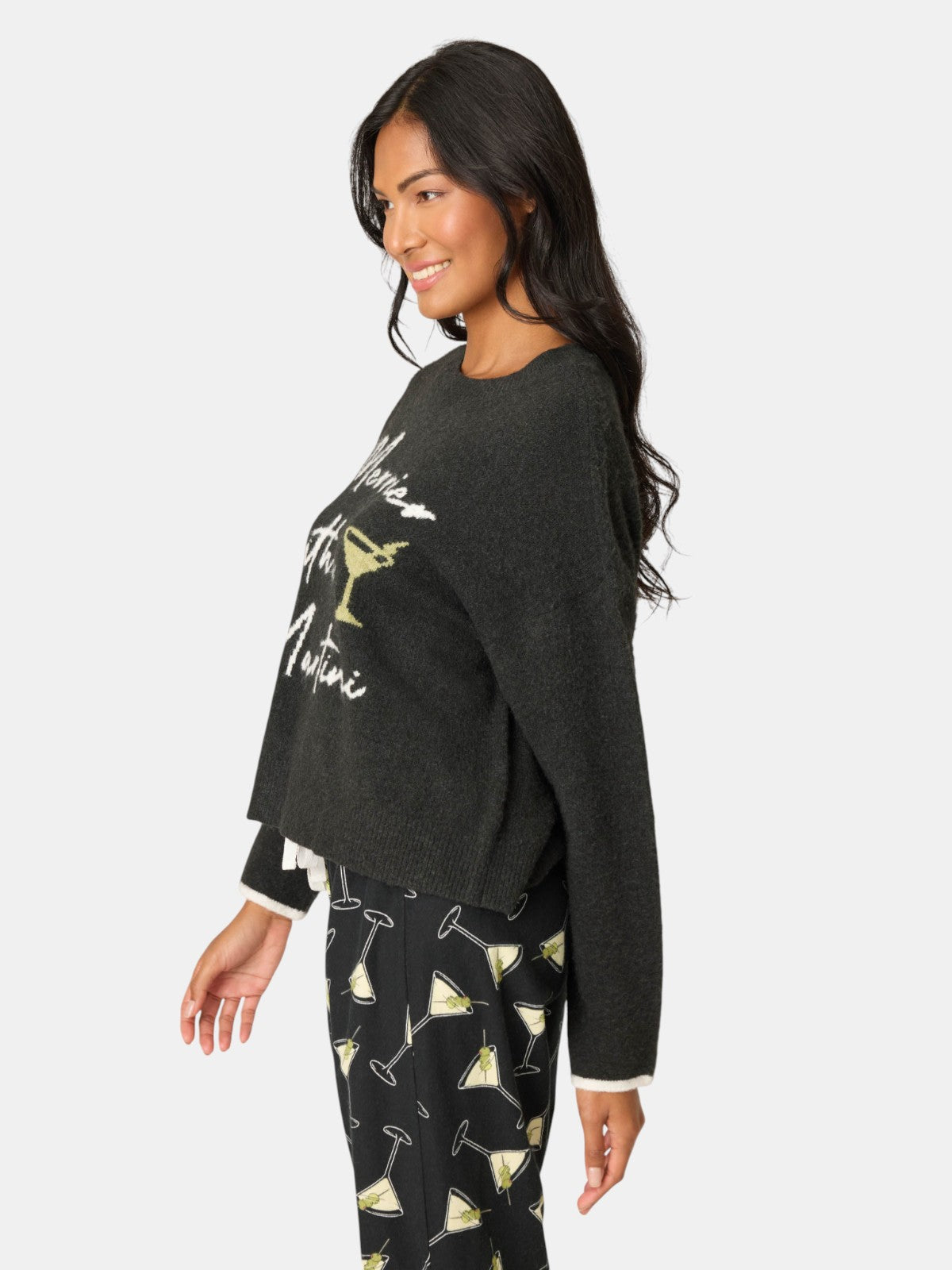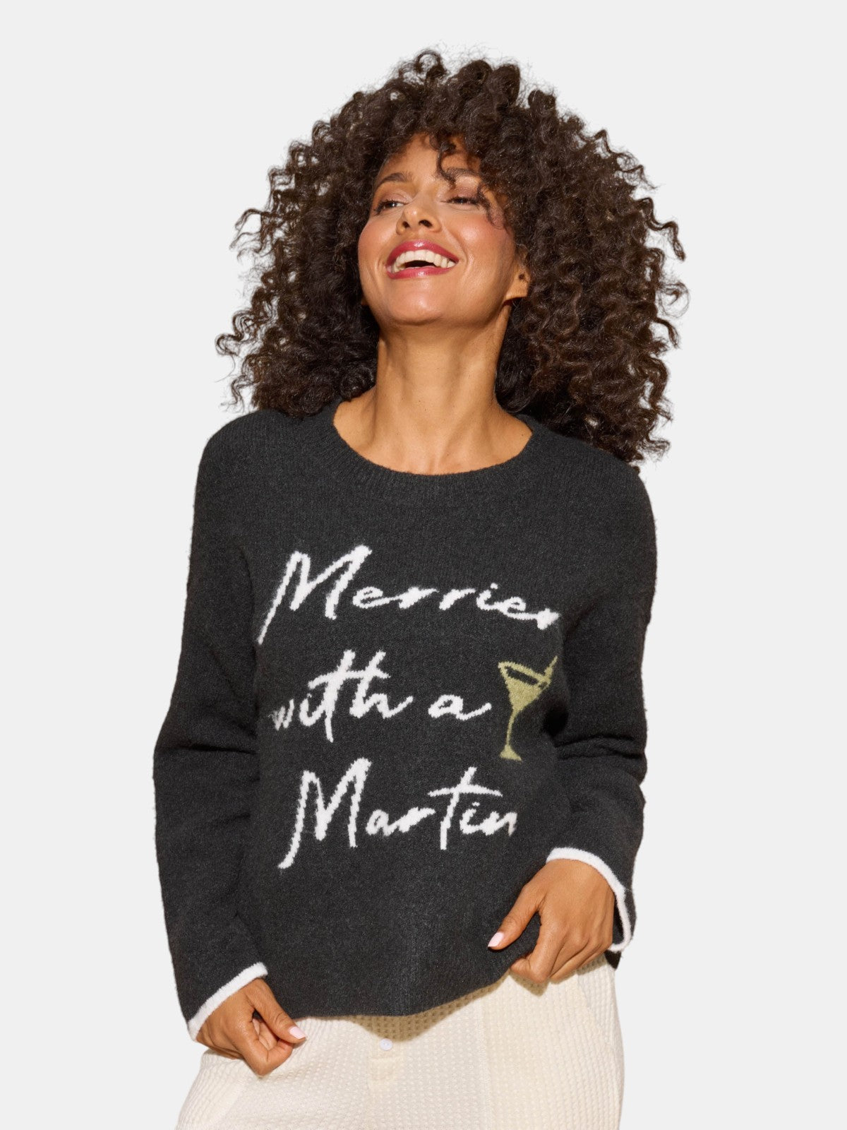 Merrier with a martini. This holiday-ready sweater is knit from soft snuggle fabric with a relaxed fit, featuring the festive graphic across the front. A cheeky layer for cozying up on the couch or sipping something celebratory fireside.