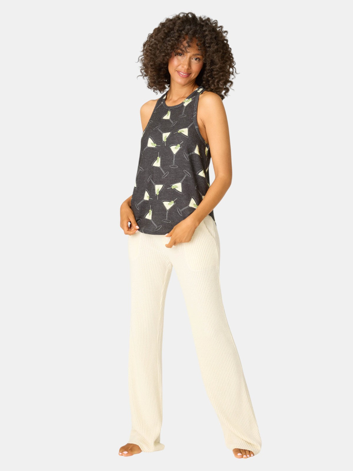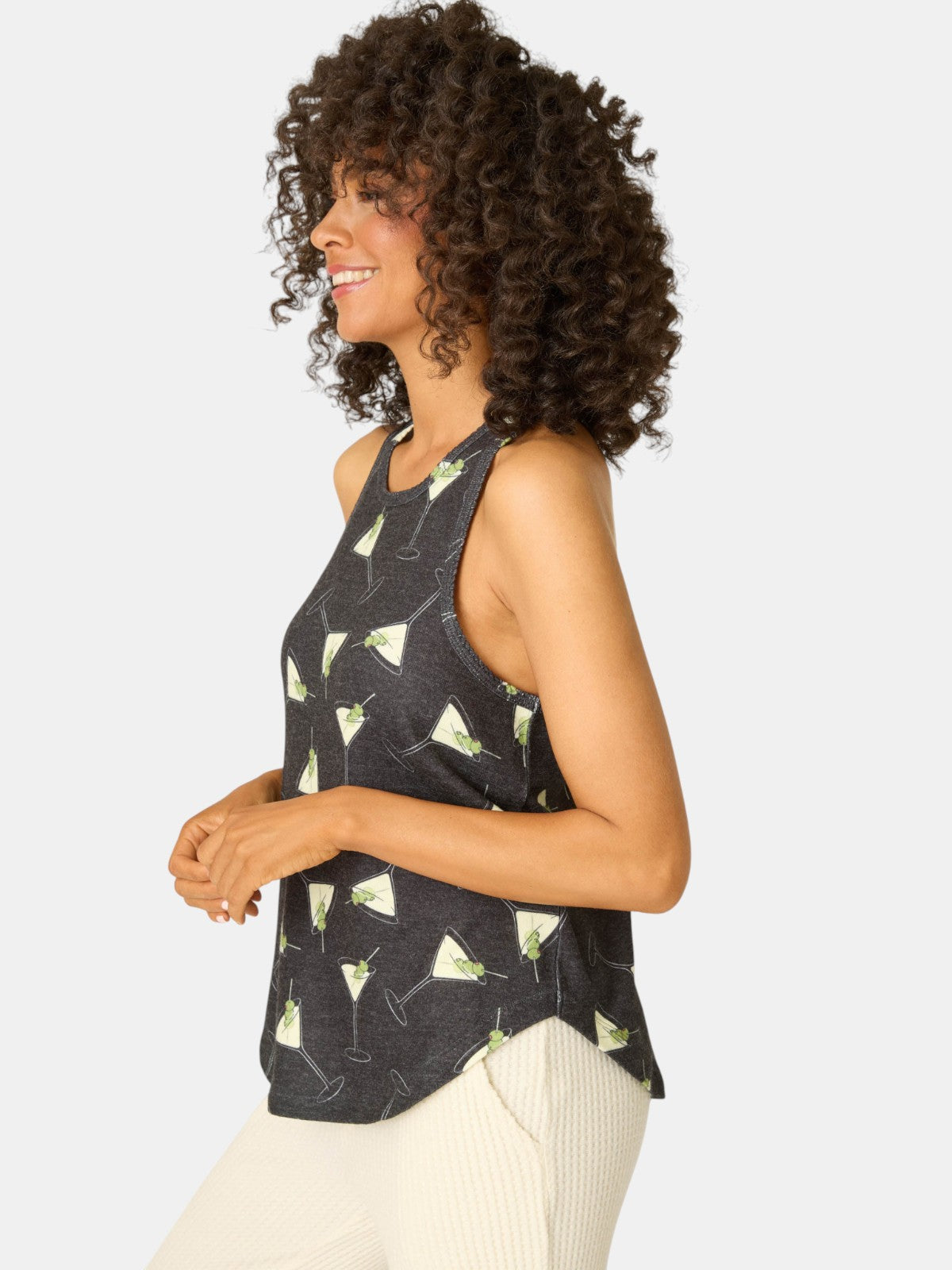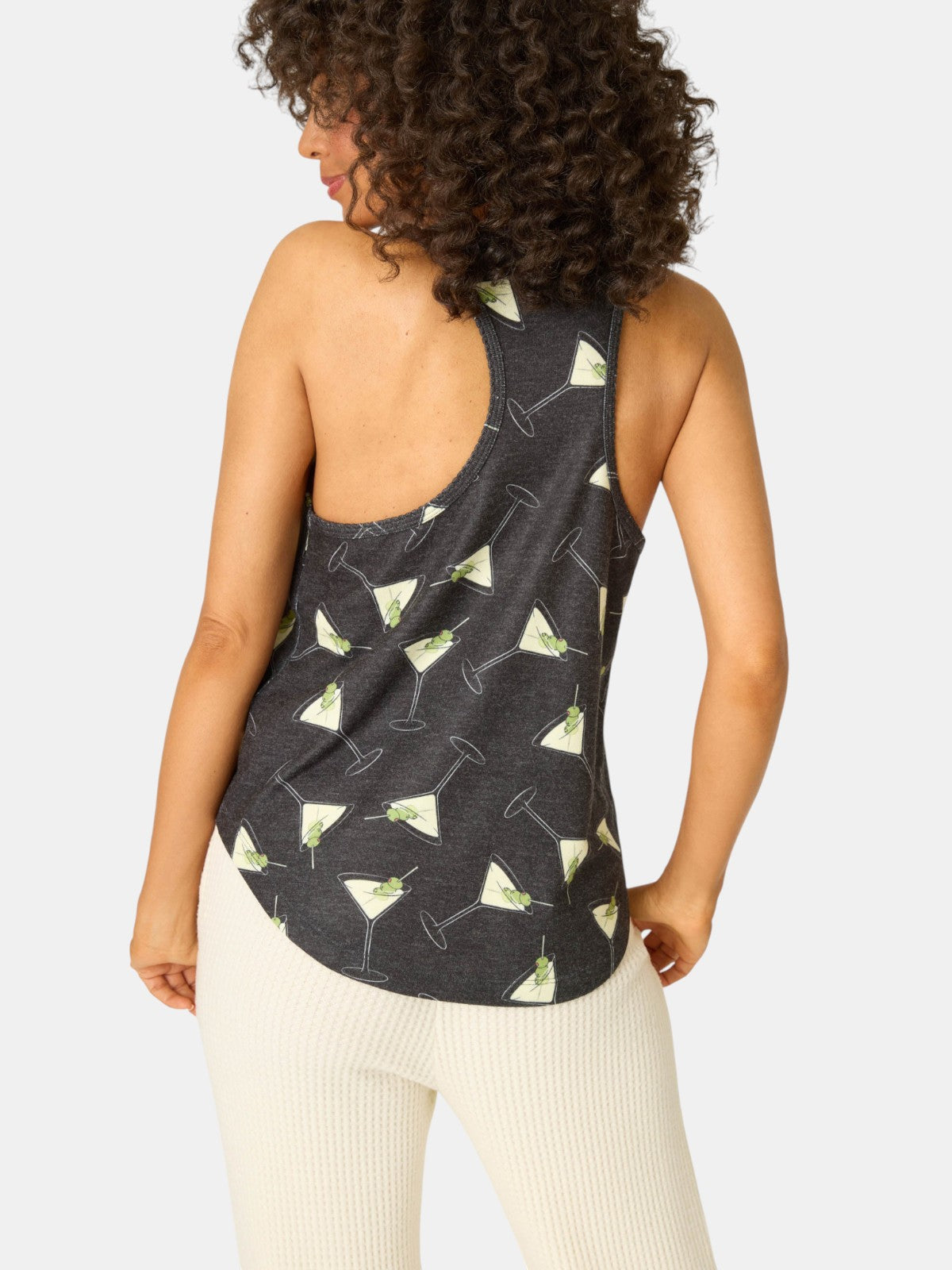 Toast the season in comfort. This racerback tank is crafted from peachy-soft knit with a festive martini glass print, complete with a green olive. Its relaxed fit makes it ideal for cozy holiday lounging or drifting off after a nightcap.