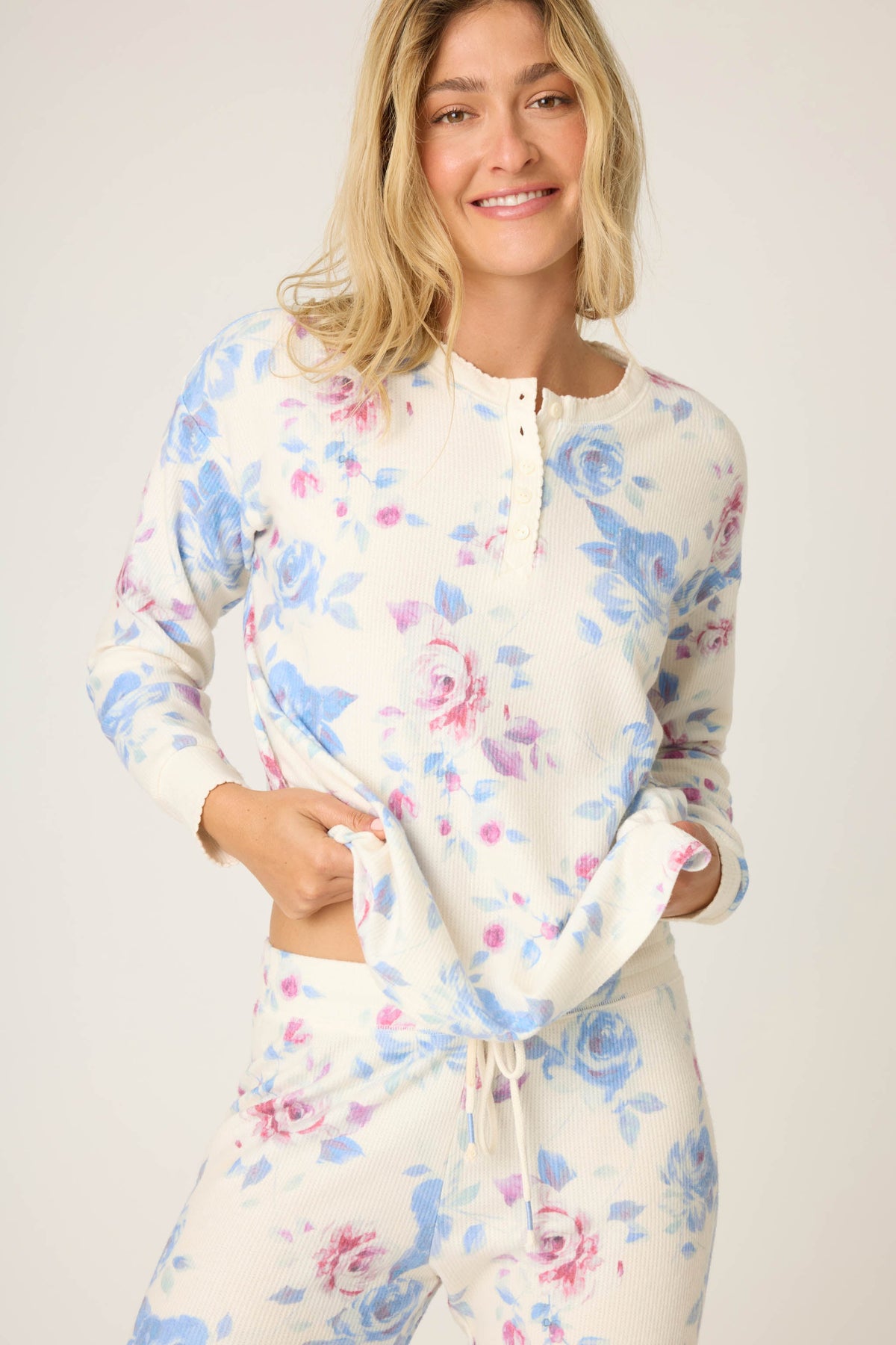 The Rodeo Rose Thermal PJ Set is cozy, feminine, and effortlessly pretty. Designed in ivory and scattered with dusty blue and blush roses, this two-piece brings a touch of vintage charm to your lounge routine. The relaxed henley top and cuffed lounge pants are made from ultra-soft thermal, blending comfort with timeless style.