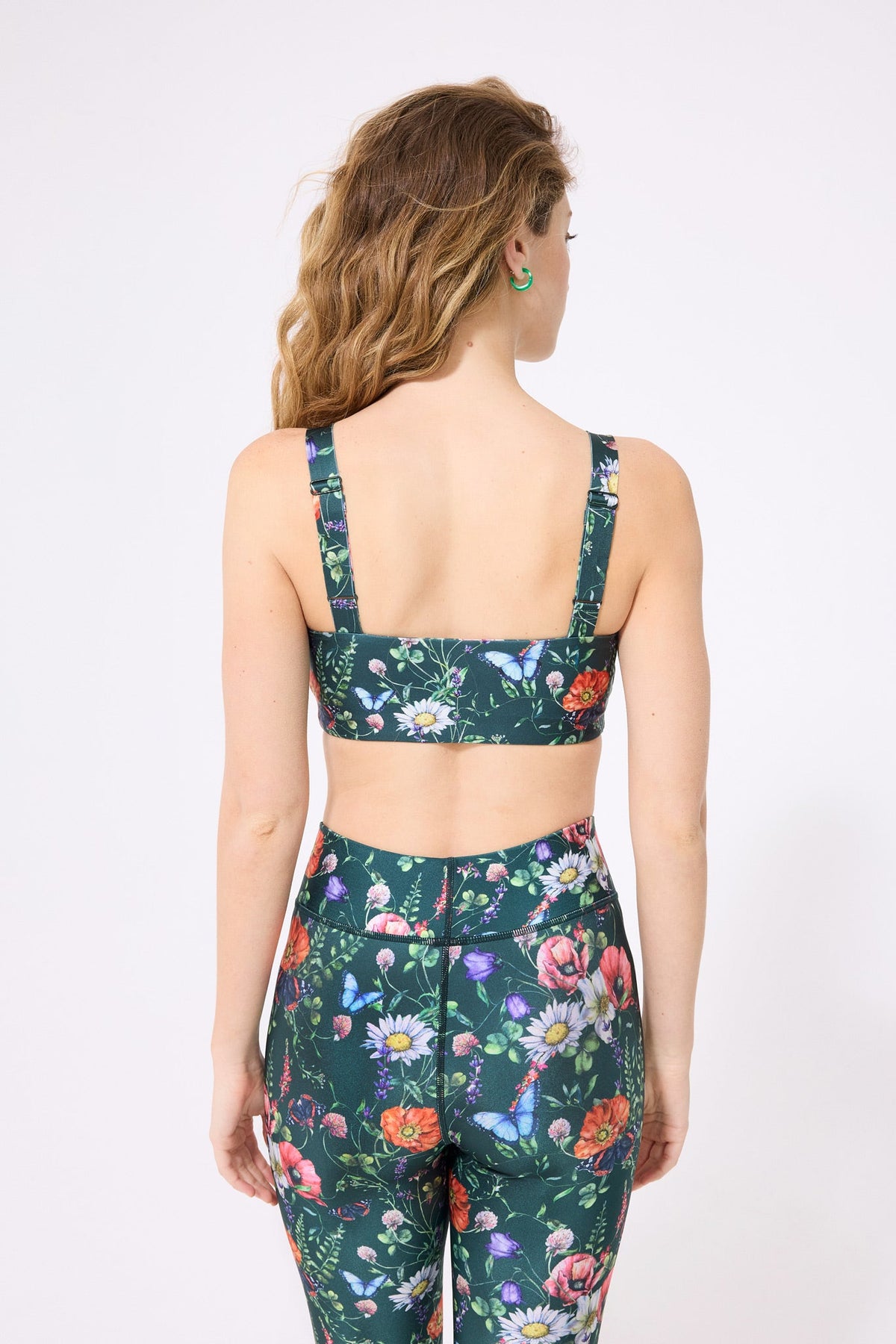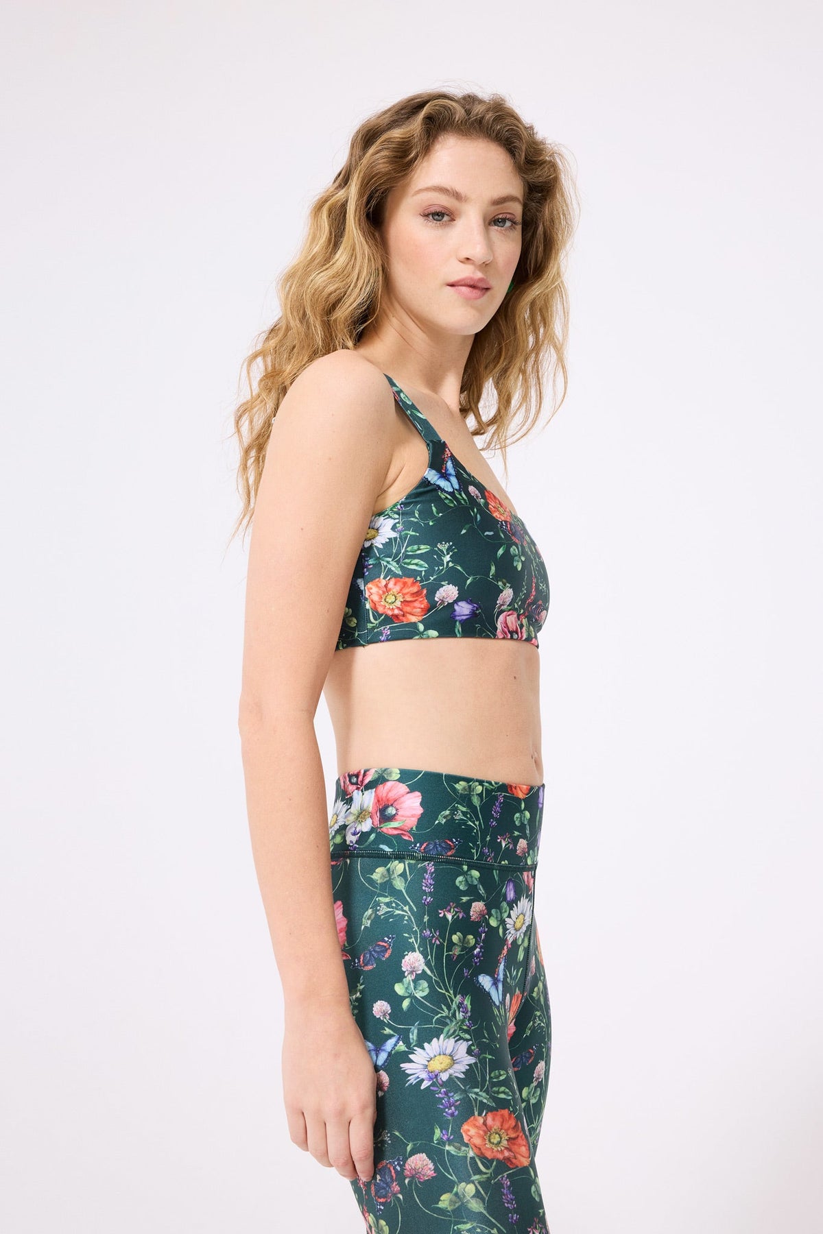 Comfort, support and butterfly floral print come together to create the sports bra you want and need right now. The scoop neck and racerback offer a sporty look with sweat-wicking and Duoknit fabric with comfortable medium support.
