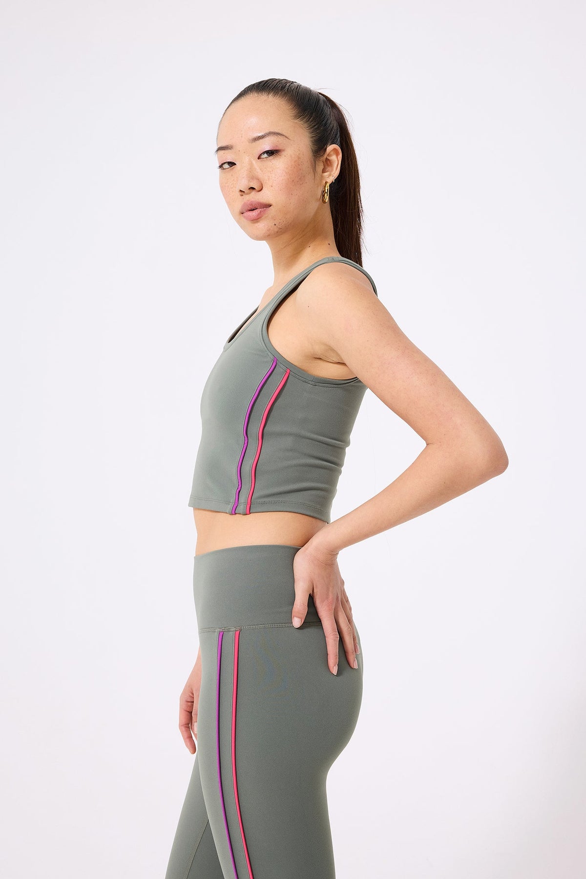 Designed for embracing the joy of comfort and movement. This crop tank features a scoop neck, piping details and hidden interior shelf bra. Experience ultimate comfort with this versatile piece.
