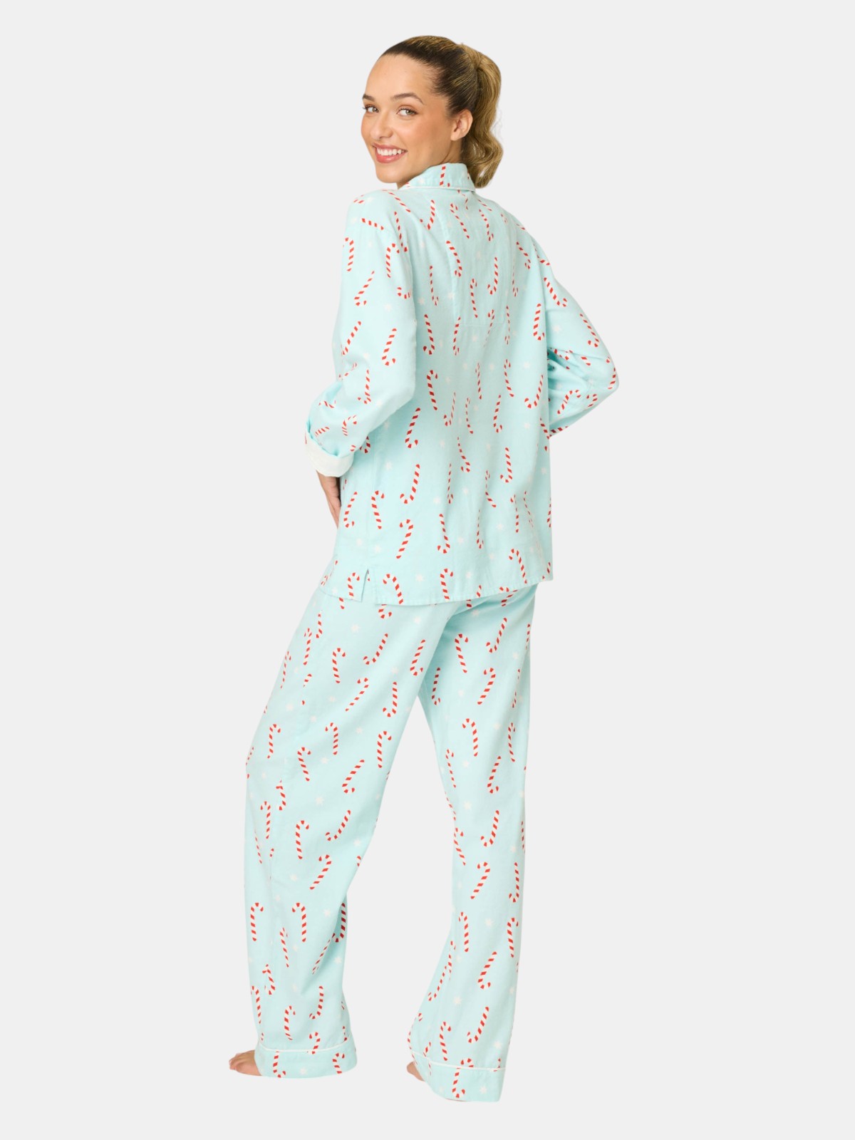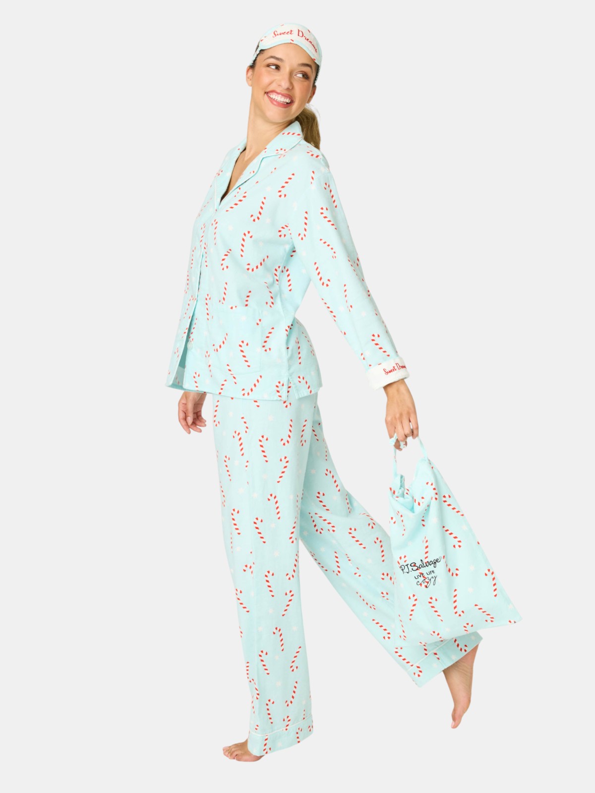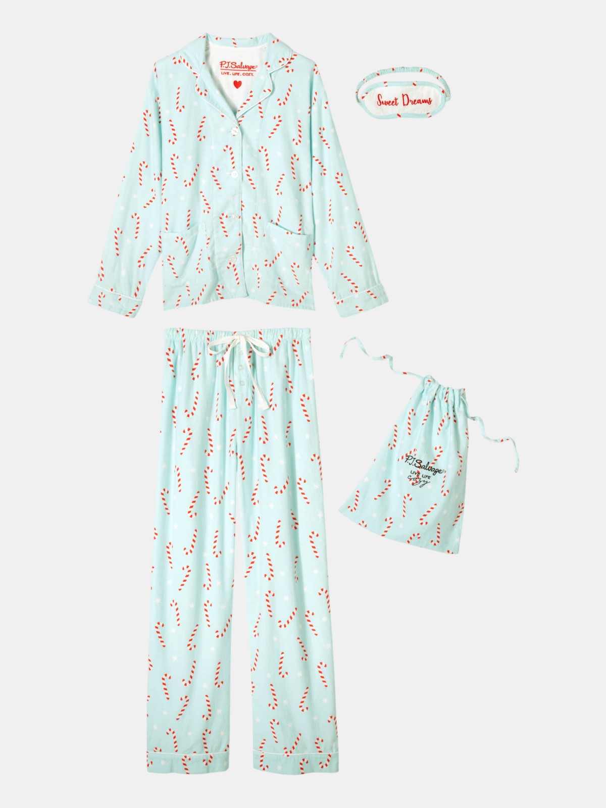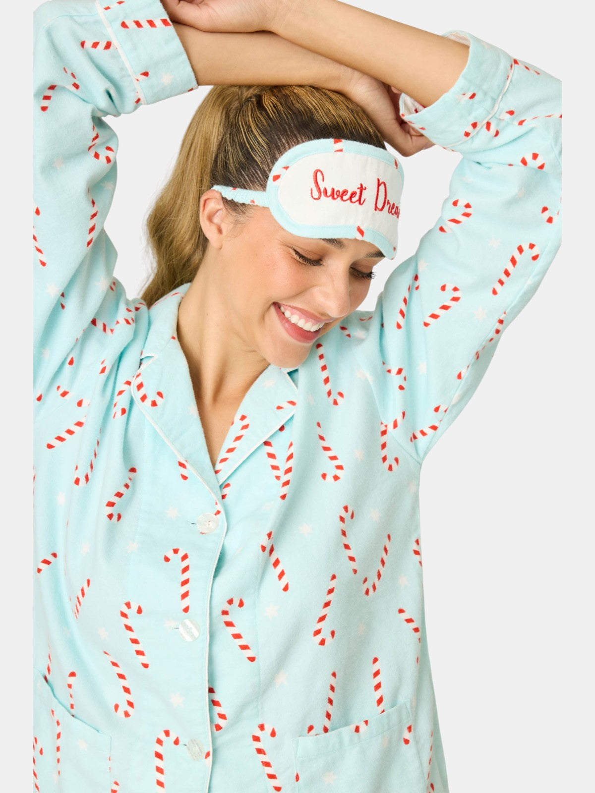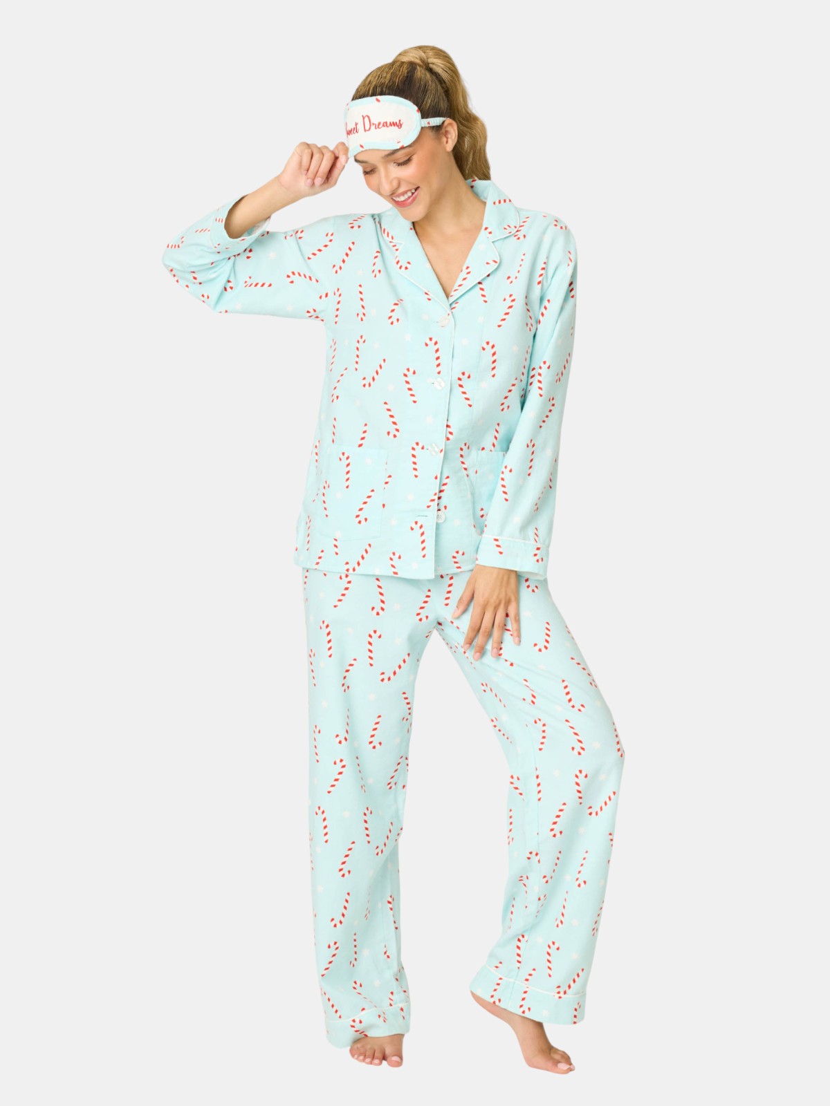Bring the sweet to the season in this light aqua cotton flannel pajama set, sprinkled with candy canes and stars. This three-piece design includes a button-up top, straight-leg drawstring pants, and a matching eye mask—made for festive mornings, holiday movie marathons, and cozy nights in.