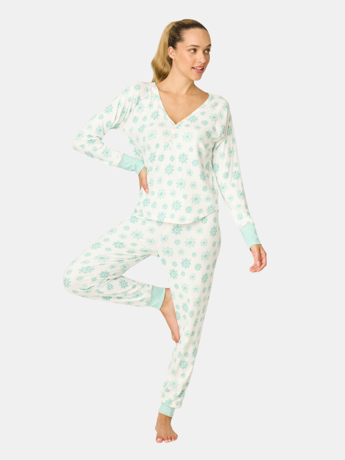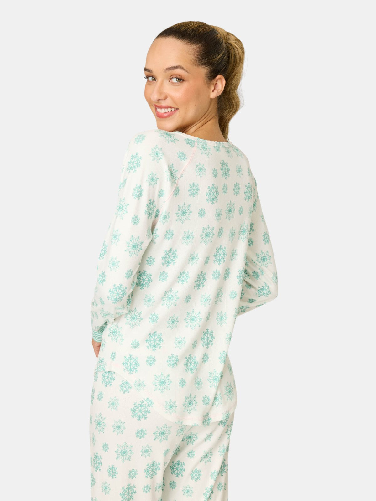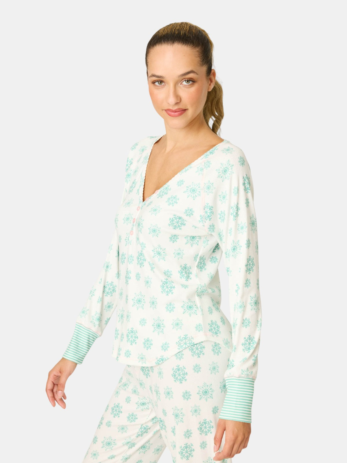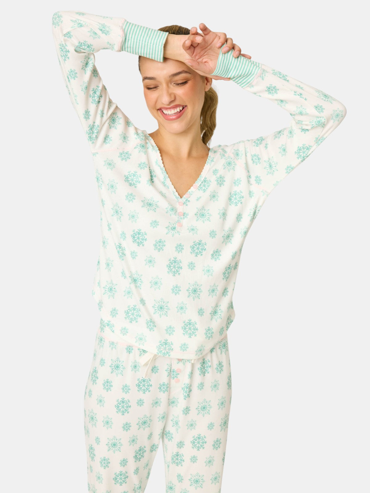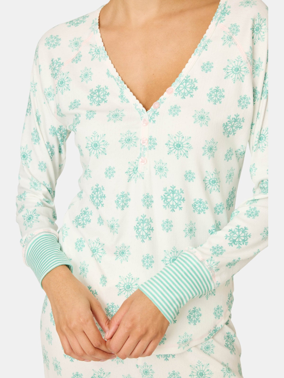 The Snowflake Wishes Pointelle Henley Top is a brushed pointelle henley top is dotted with green snowflakes, finished with striped cuffs and pink button detail. Soft and festive, it’s a holiday essential for nights in and frosty mornings.